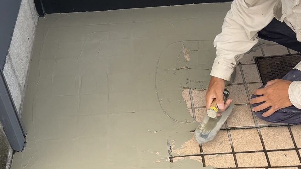 床についたコケなどを清掃した後、モルタルを塗り込んでいきます。