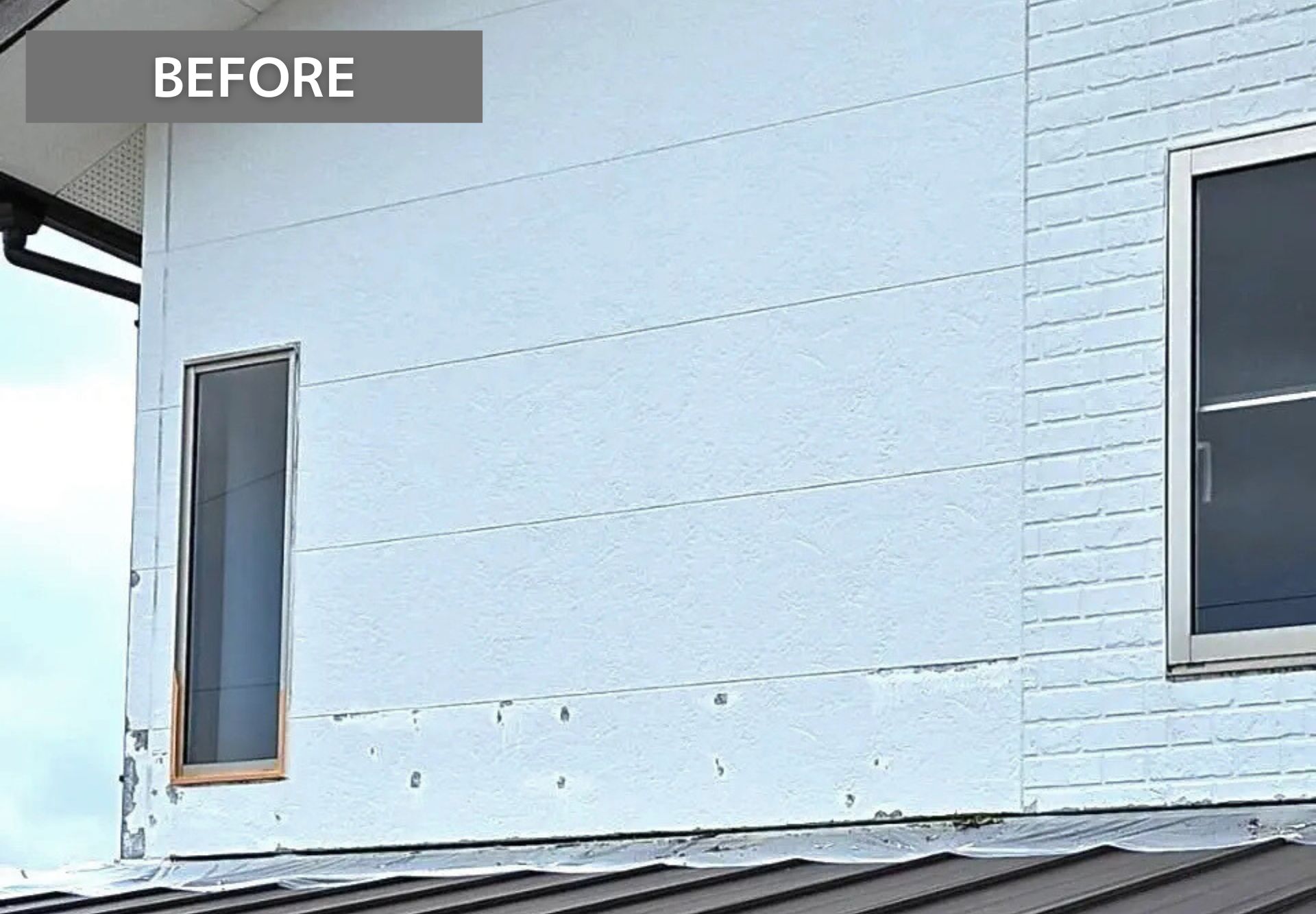 外壁にひび割れや細かな欠けが見られ、塗膜の劣化も進んでいる状態でした。雨水の侵入やさらなる傷みにつながる可能性があります。今回の塗装では、傷んだ部分をしっかり補修し、下地から整えたうえで塗り直していきます。