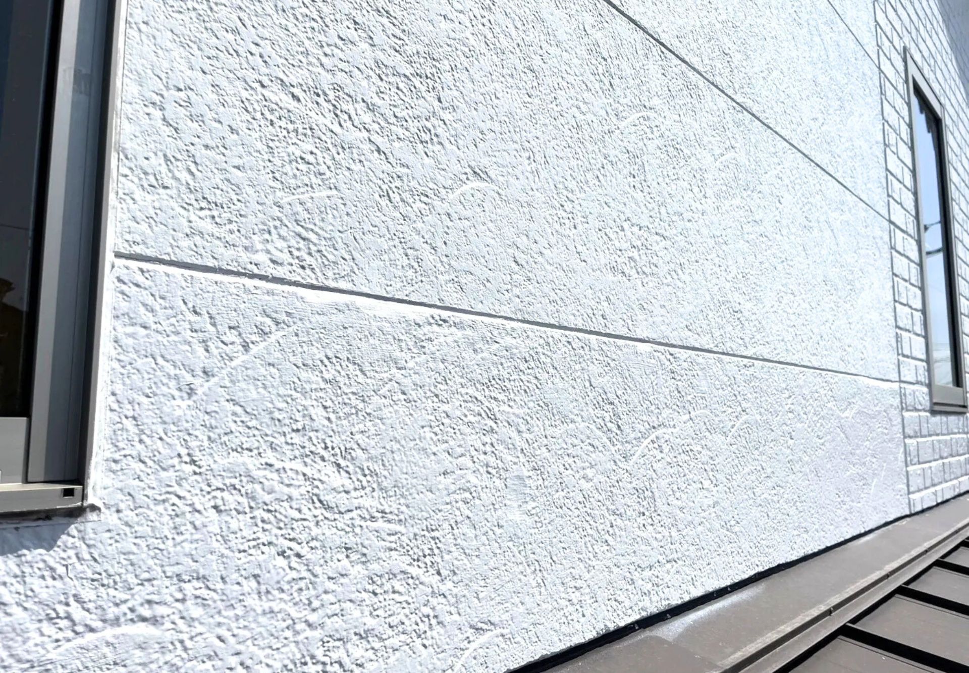 傷んでいた外壁部分をしっかりと補修します。ひび割れや剥がれていた部分を下地処理し、外壁の表面を整えて塗装作業に入っています。耐久性の高い塗膜に仕上げています。
