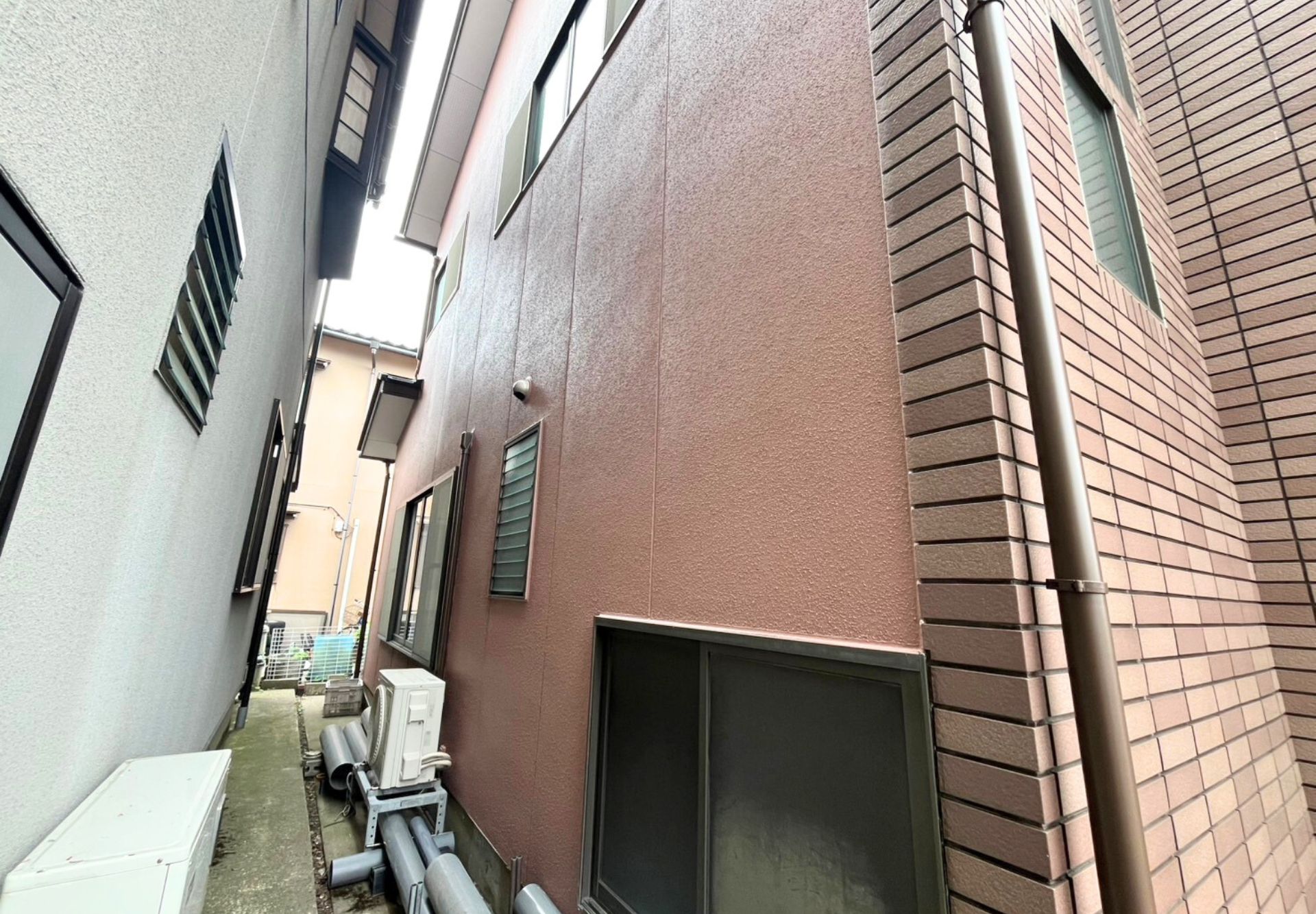 外壁の中塗りを行っています。今回は、あずき色のような赤みを抑えたあたたかみを感じる色に。塗り重ねるごとに色がしっかり出てきて、やわらかく上品な印象になってきました。完成が楽しみです。