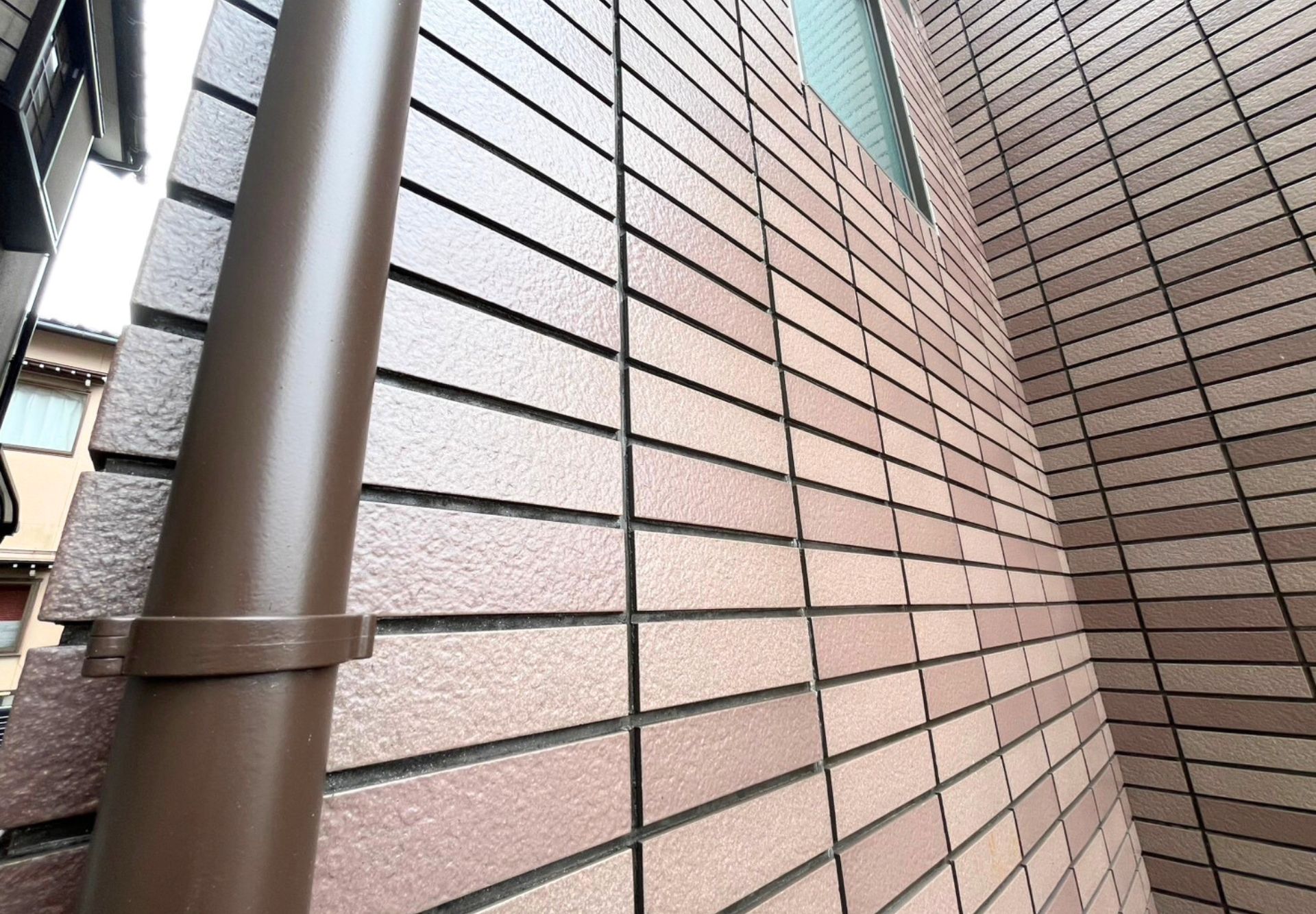 外壁タイル面の防水塗装を行っています。タイルの風合いはそのままに、しっかり防水層をつくる工程です。雨水の染み込みを防ぎながら、長持ちするように仕上げていきます。