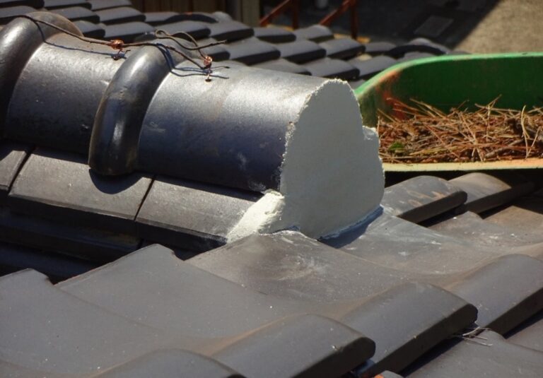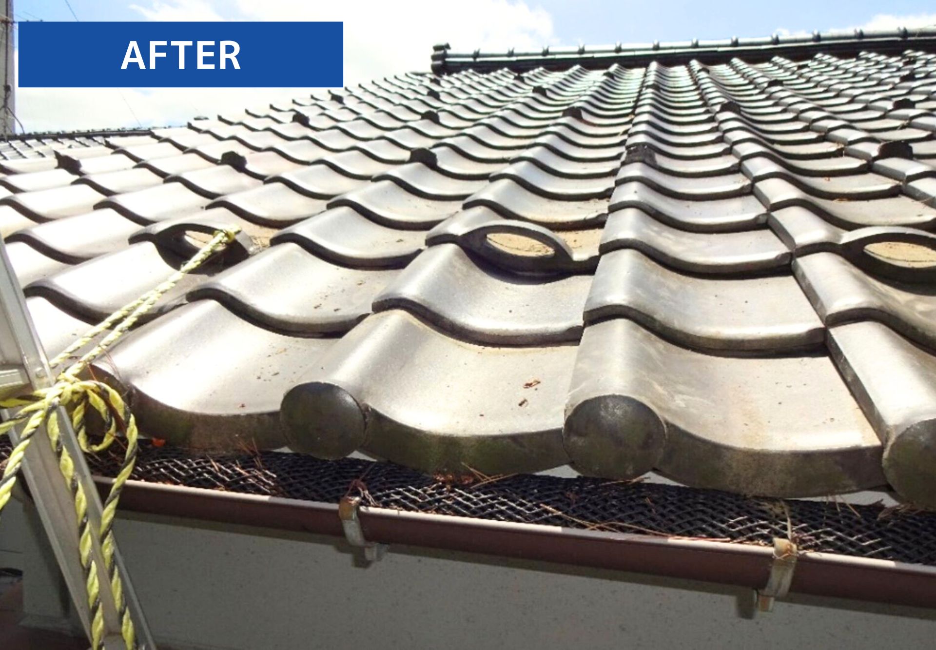 棟瓦修理後です。棟瓦のズレや劣化部分をしっかり修理し、屋根の雨水の流れを整えました。雨漏りのリスクを軽減できます。