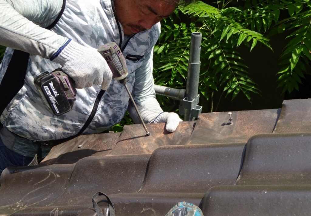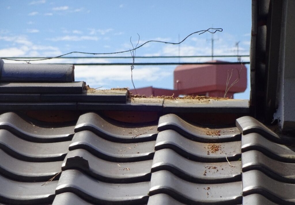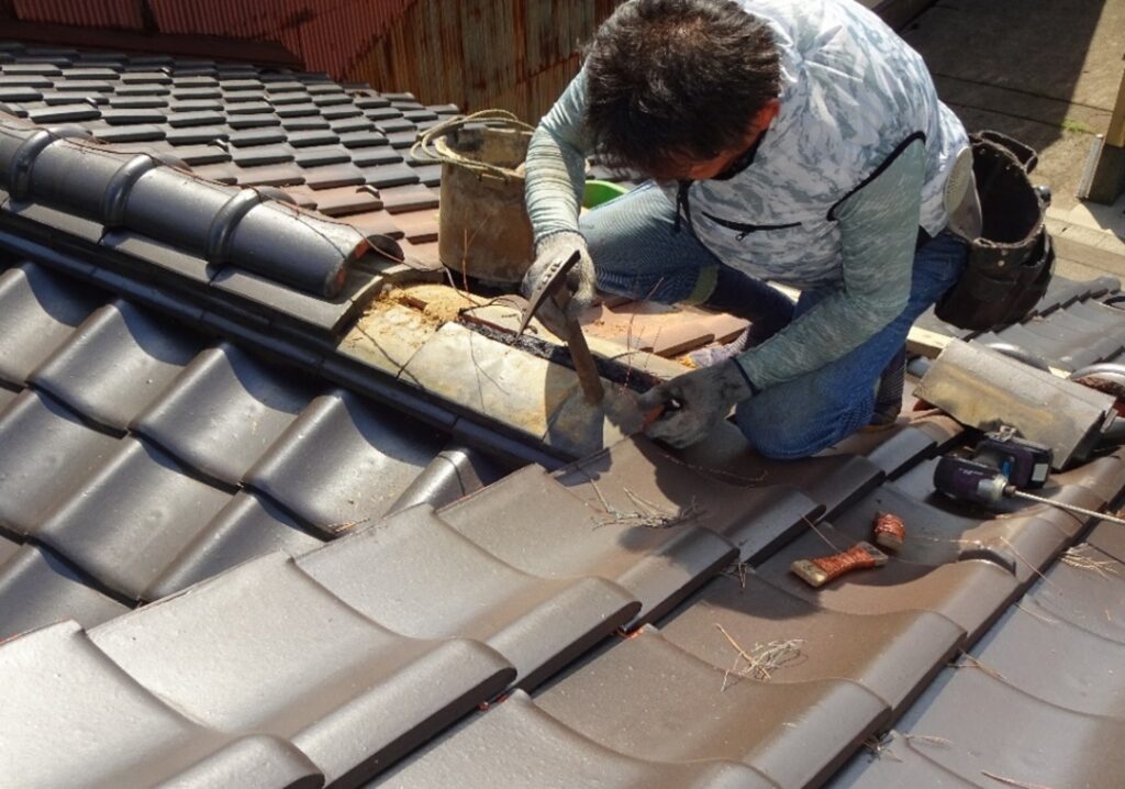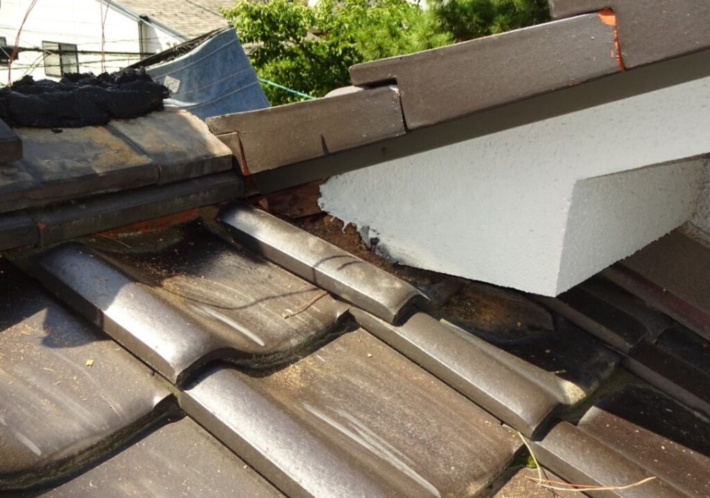 大屋根瓦のズレを修理した後、棟瓦の劣化部分を解体し、棟瓦を修理していきます。