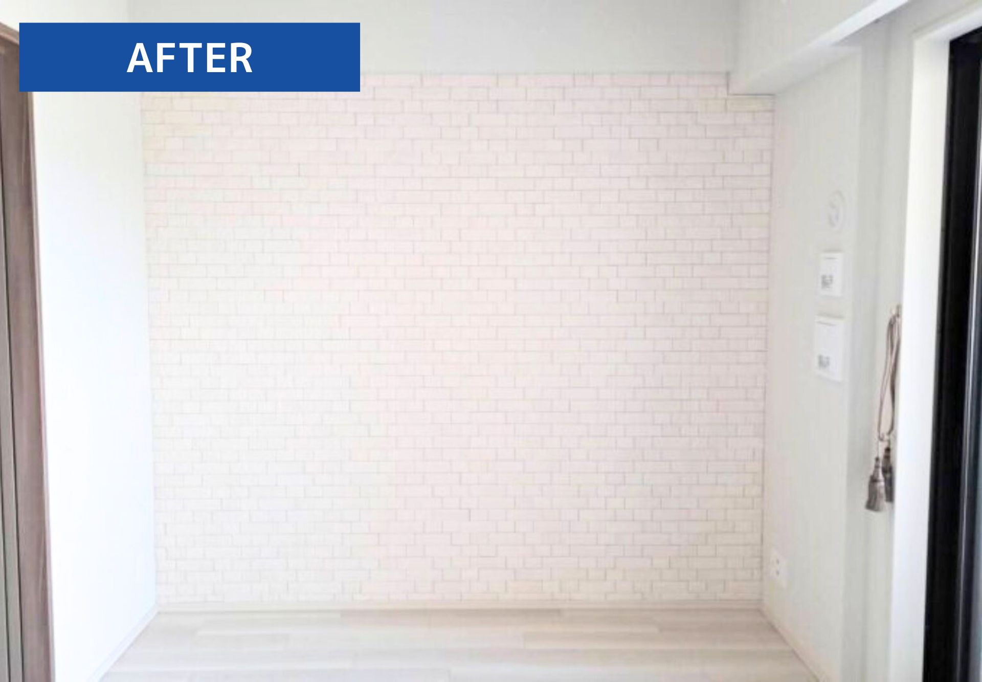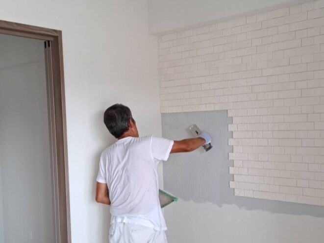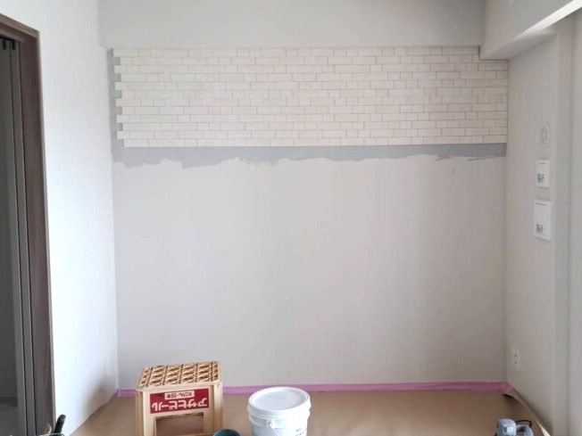 デザインタイル貼りが完了しました。デザインタイルを貼ったことで、シンプルだった空間に立体感とアクセントが加わり、こだわりのある空間になりました。タイル施工や内装リフォームをお考えの方は、お気軽にご相談ください。