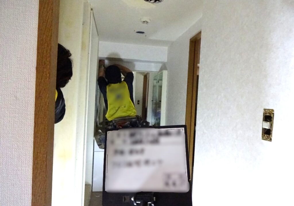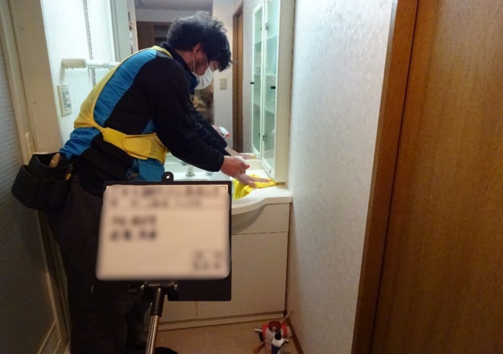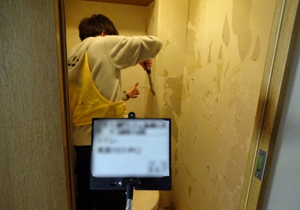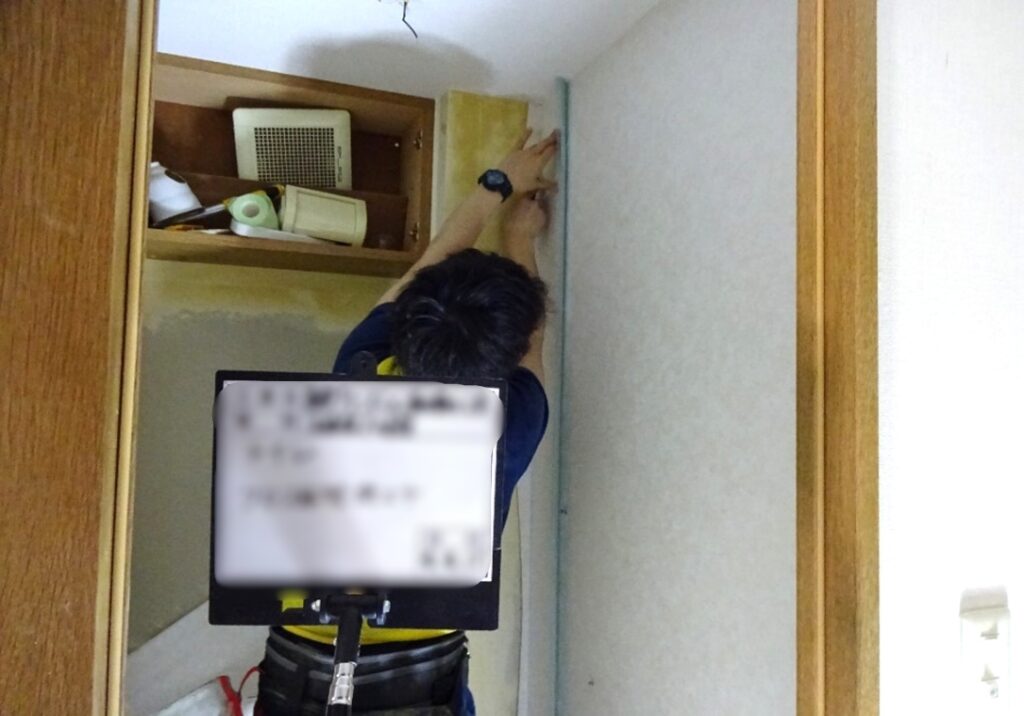 洗面脱衣室・トイレのクロスを捲り、新しいクロスに張り替えていきます。洗面脱衣室の吸気口と、トイレのダウンライトを撤去し、仕上げに清掃クリーニングを行い、完成です!