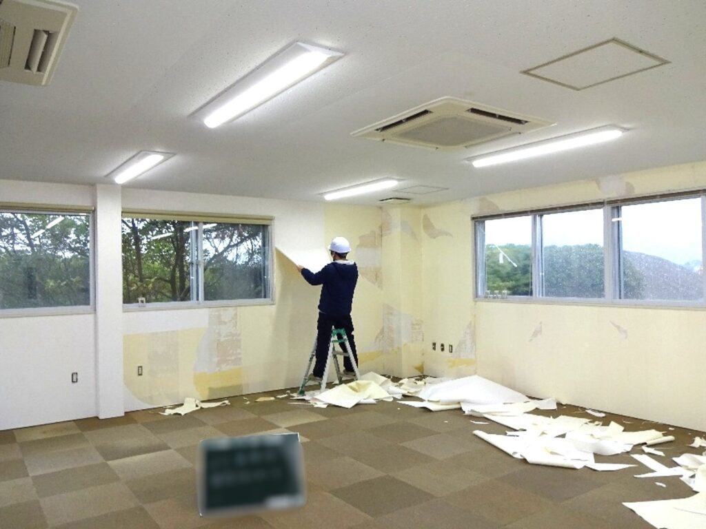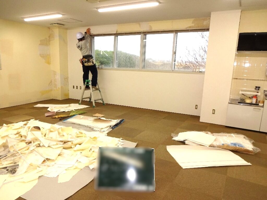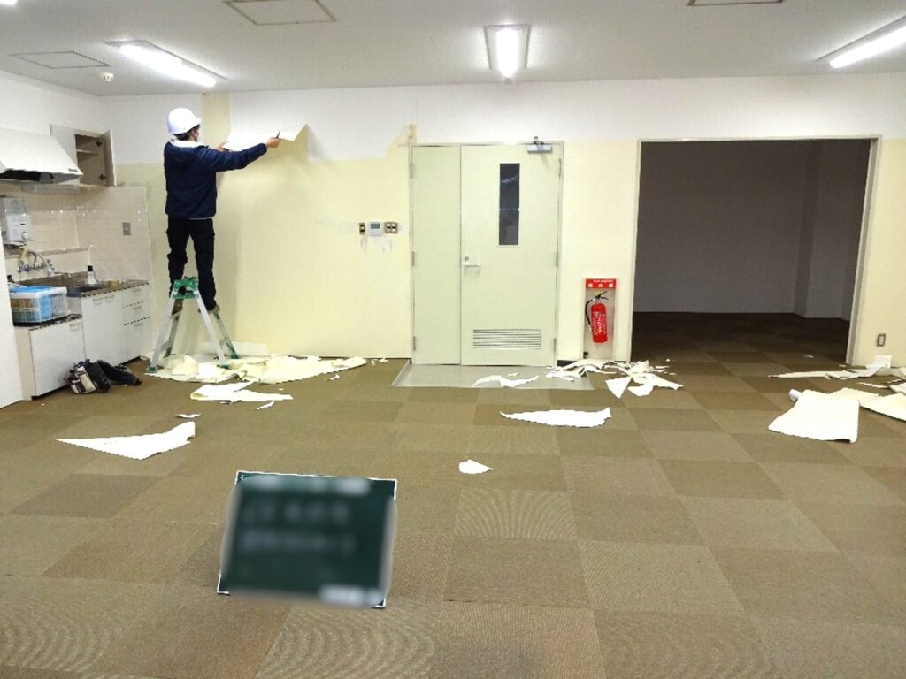 まず既設のクロスをめくり、下地の状態を確認します。その後、凹凸やビス跡をパテでしっかり補修し、表面を平らに整えます。下地処理が完了してから、新しいクロスを貼り替えていきます。