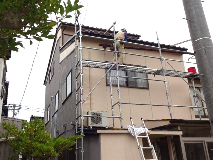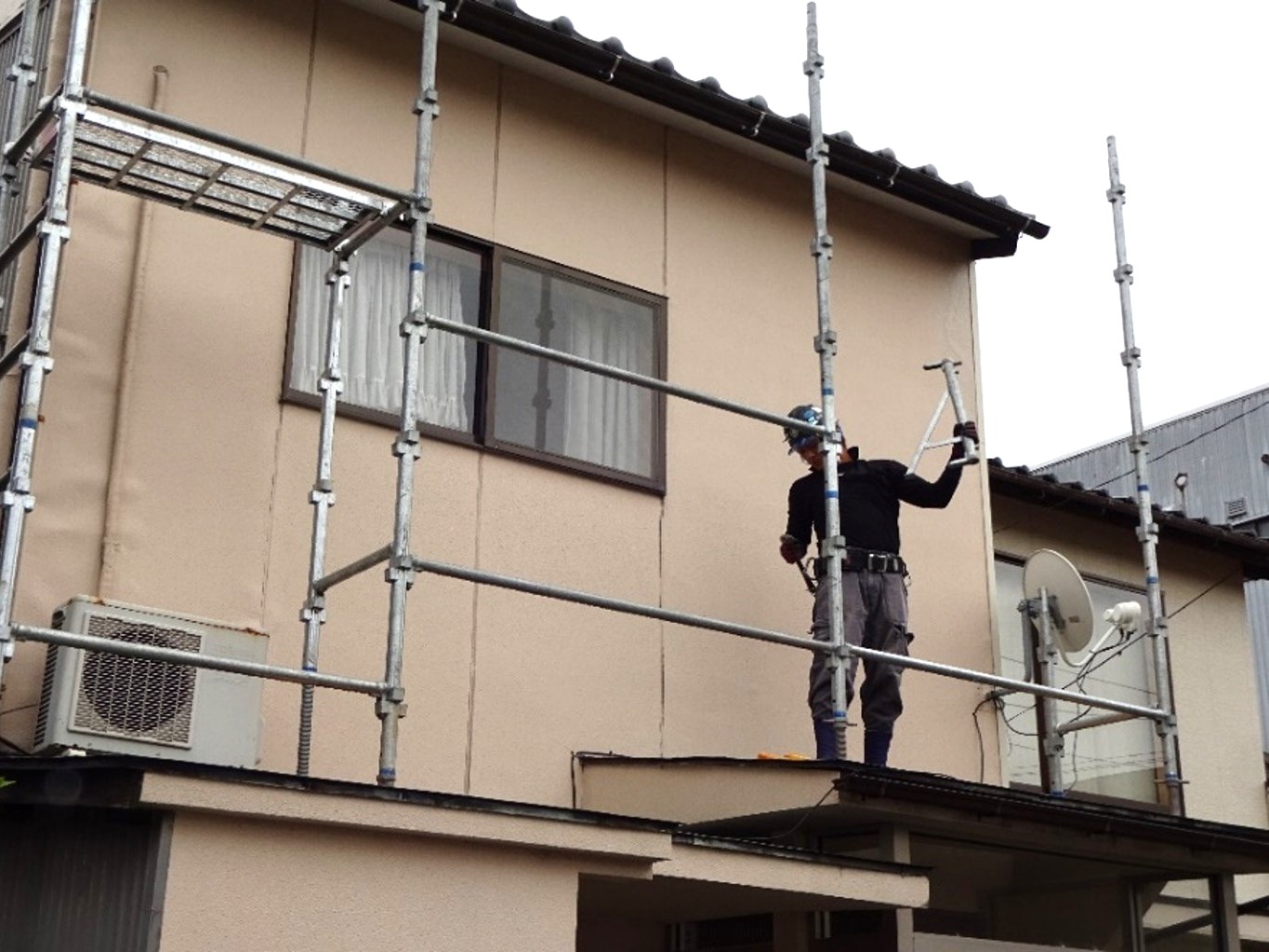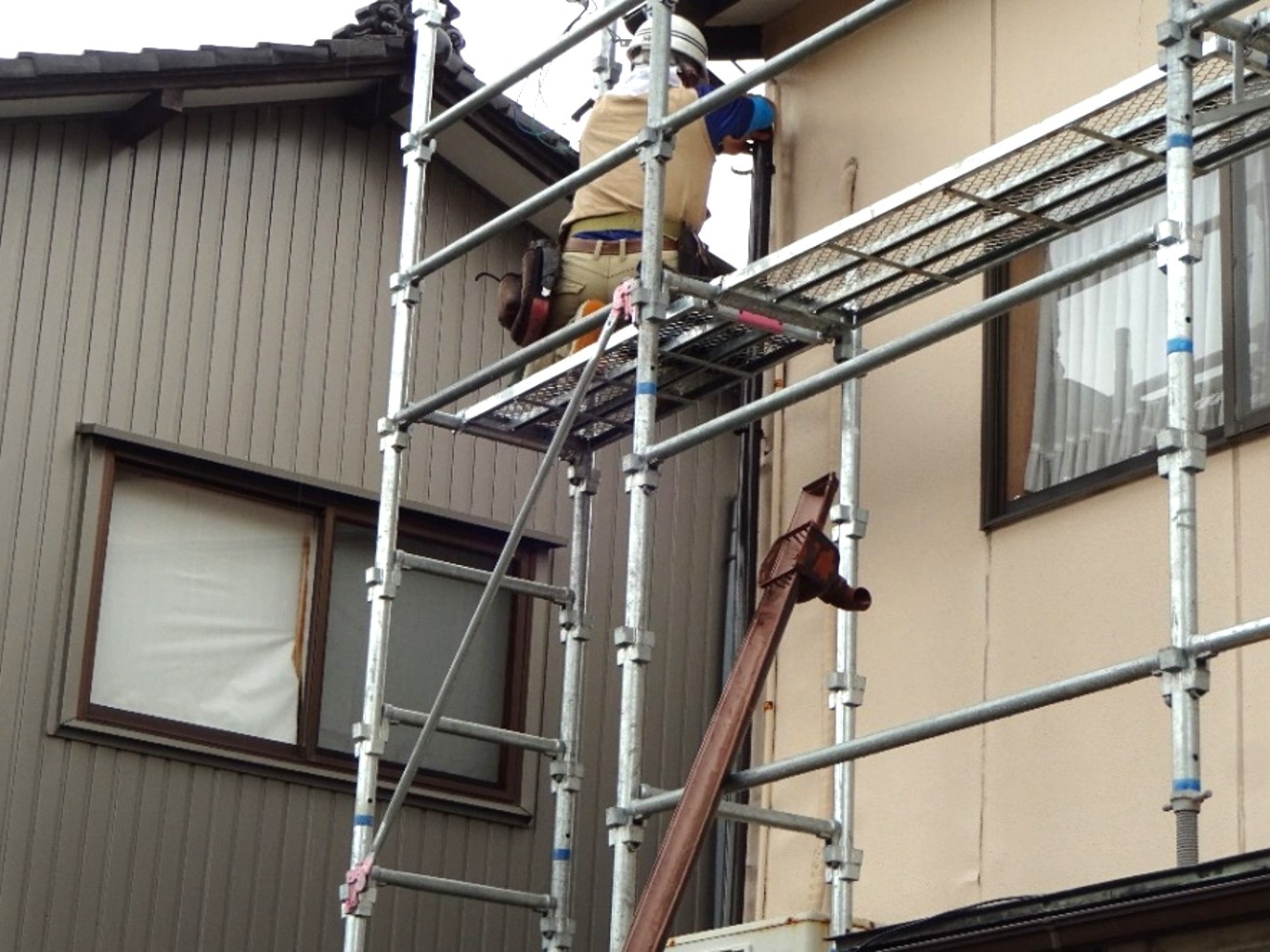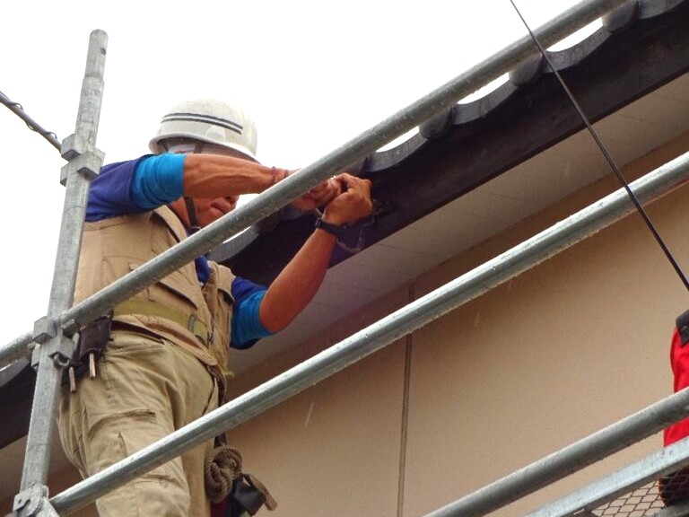 雨樋を解体・撤去した後、新しい雨樋を設置しました。設置作業中はしっかり固定しながら調整し、最後に外部足場を解体して作業完了です!