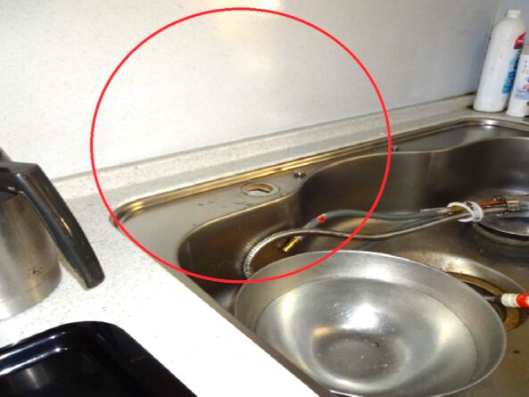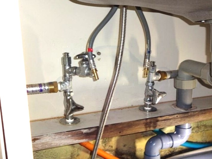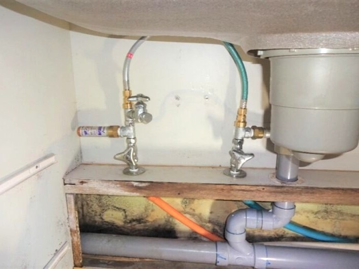 既設キッチンの水栓を取り外すため、配管を切り離し作業を進めていきます。交換後、水漏れチェック・動作確認を行います。