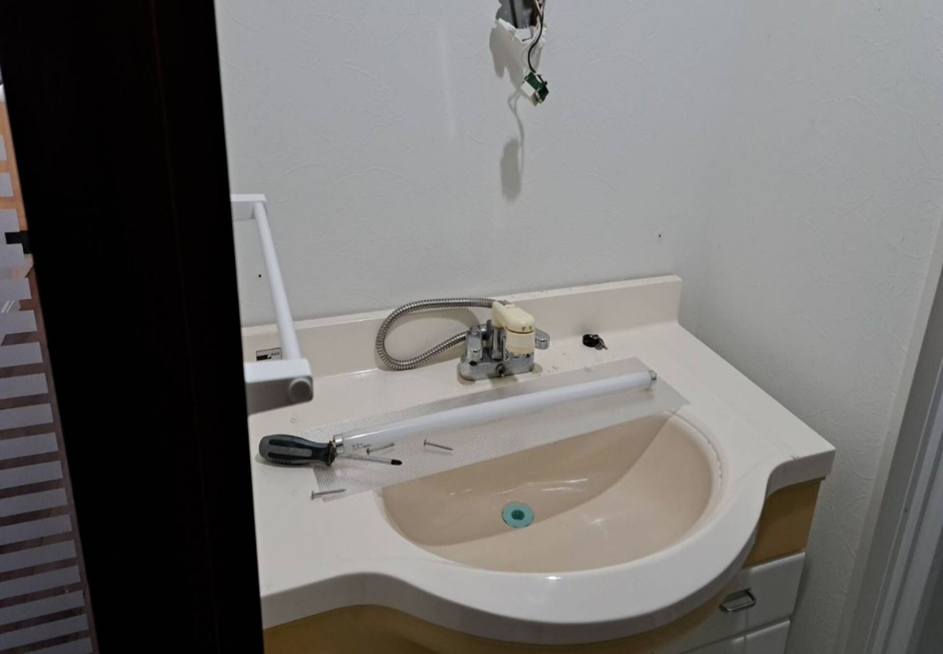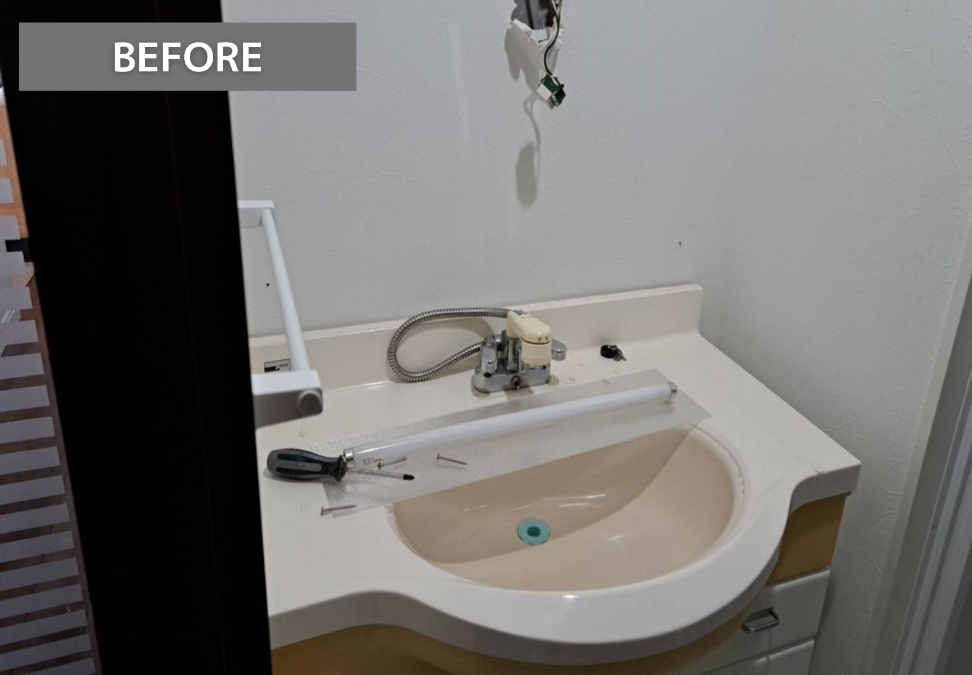 古くなった洗面化粧台や床・壁を、今回のリフォームで新しく交換。使いやすく、明るい空間に生まれ変わります。