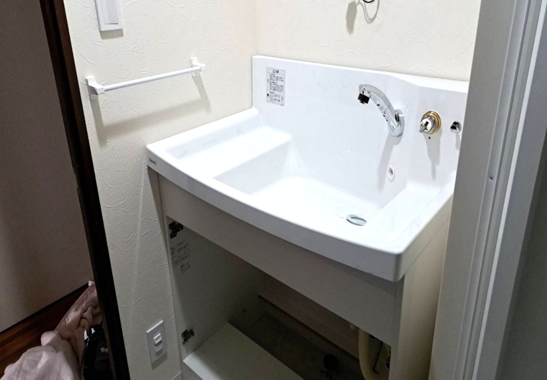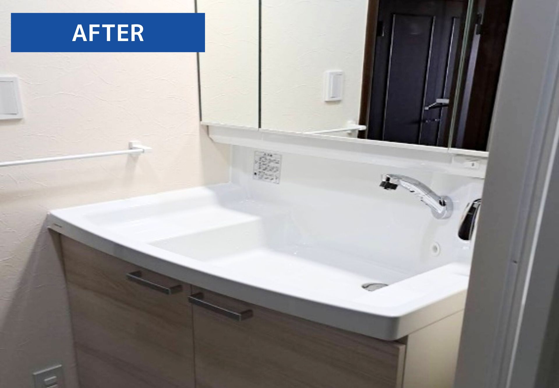 洗面所リフォームが完了しました。今回のリフォームでは、洗面化粧台を新しいものに交換し、使い勝手や収納力もあがりました。合わせて床はクッションフロアに貼り替え、壁のクロスも一新。明るく快適な洗面空間になり、毎日の身支度もよりスムーズに行えるかなと感じております。洗面所リフォームをお考えの方は、お気軽にご相談ください。