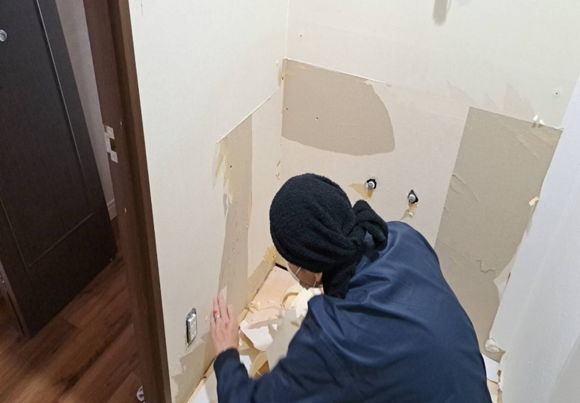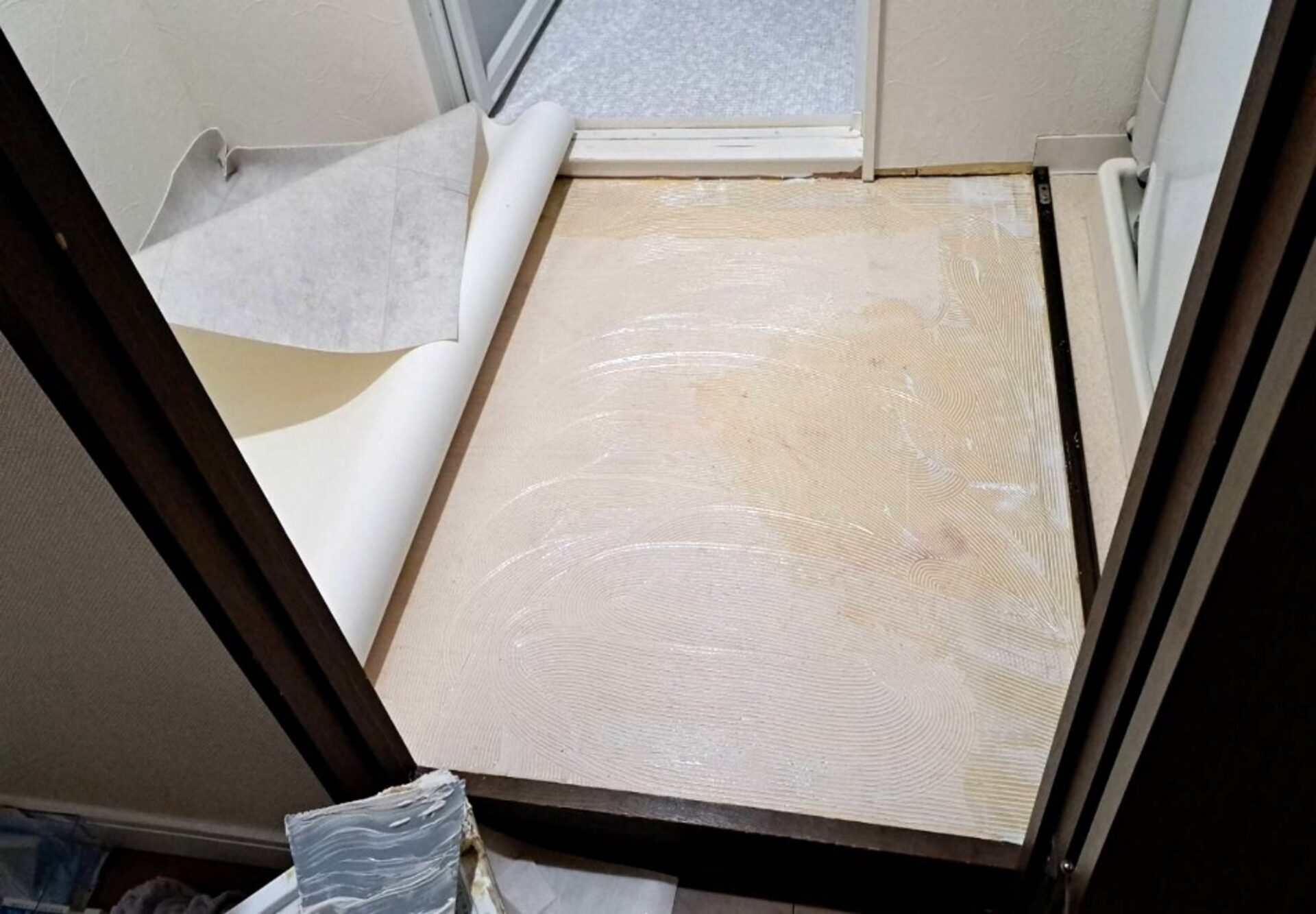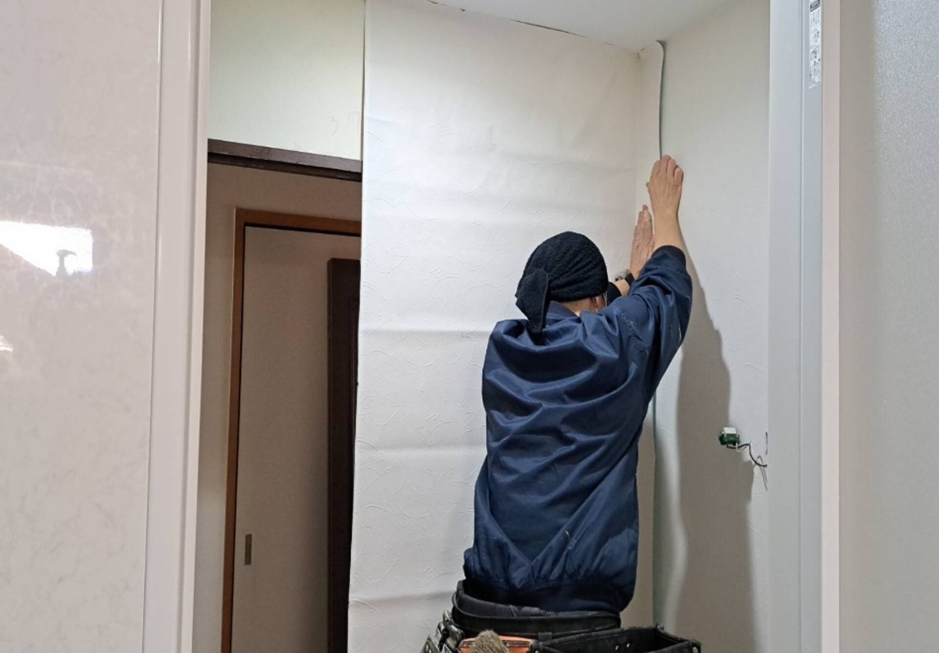 壁クロスを剥がし、新しいクロスを貼り替えていきます。床はクッションフロアを施工し、最後にソフト巾木を取り付けて仕上げていきます。