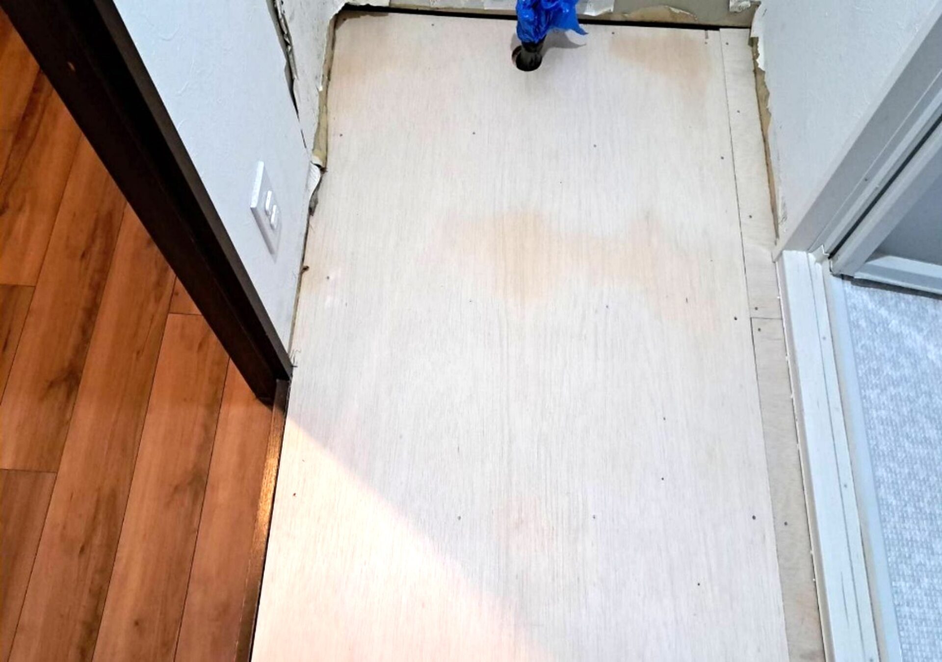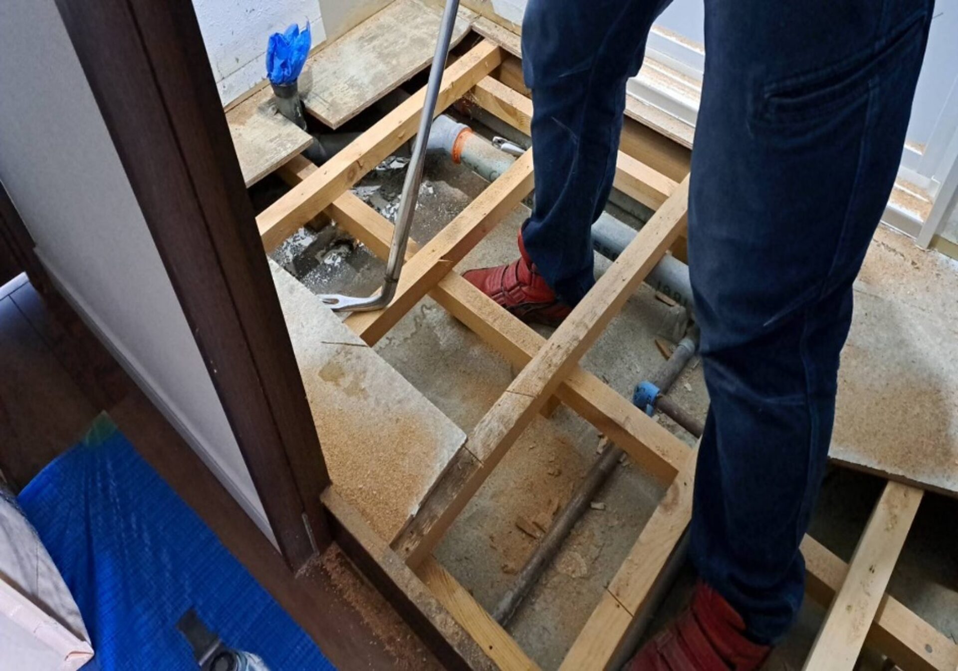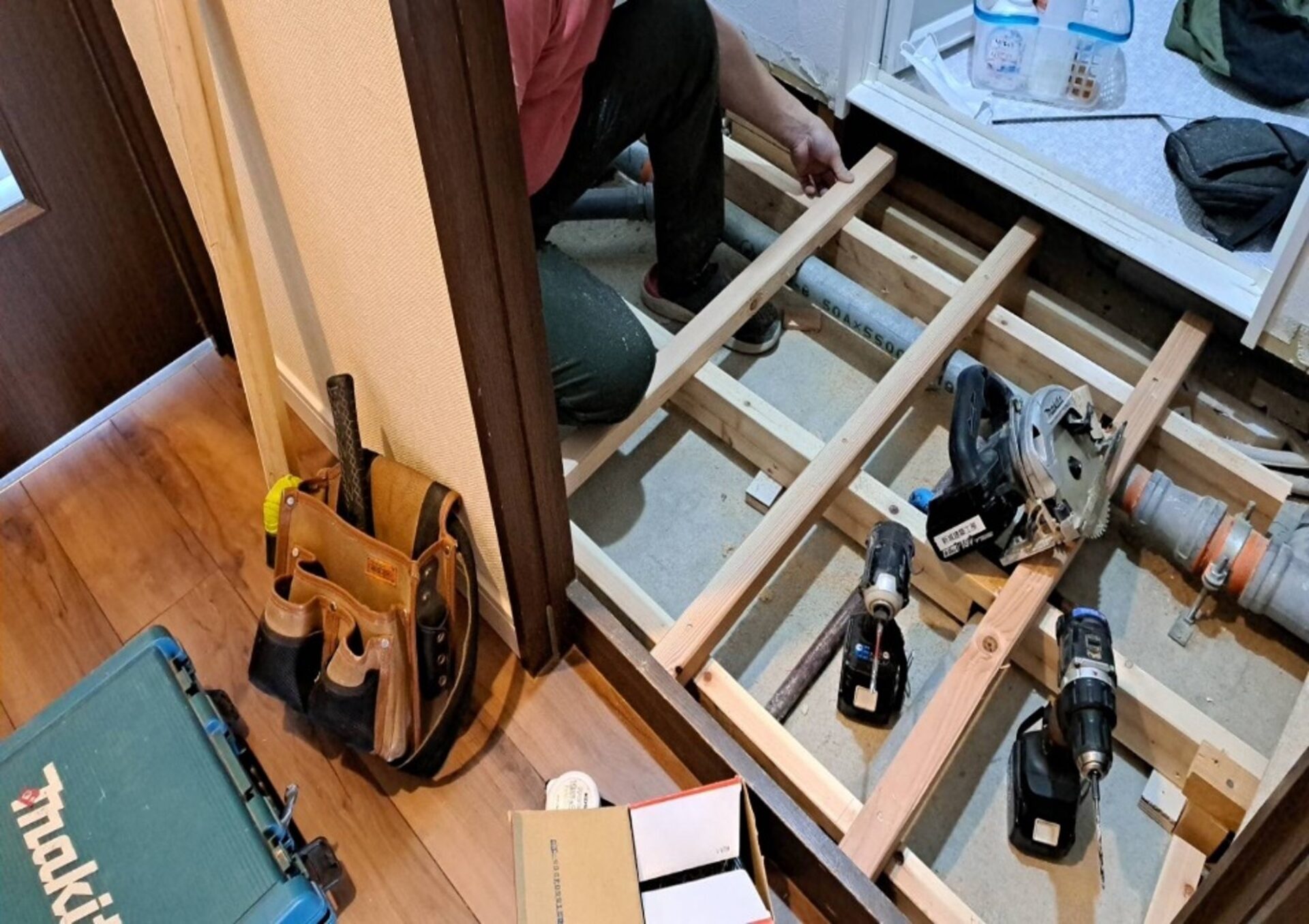 まずは洗面化粧台を撤去し、床を解体します。大工が新しい床組みを作り、下地をしっかり整えたうえで床を二重に張って丈夫に仕上げていきます。