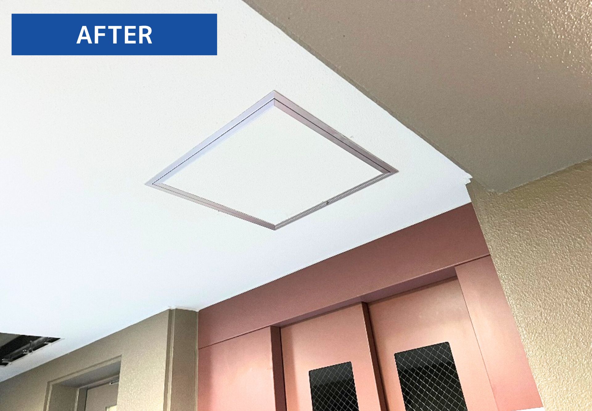 天井補修および点検口の新設が完了しました!今後の点検やメンテナンスもスムーズに行える環境が整いました。天井の不具合や点検口の新設・移設など、小さな工事も対応しております。お気軽にご相談ください。