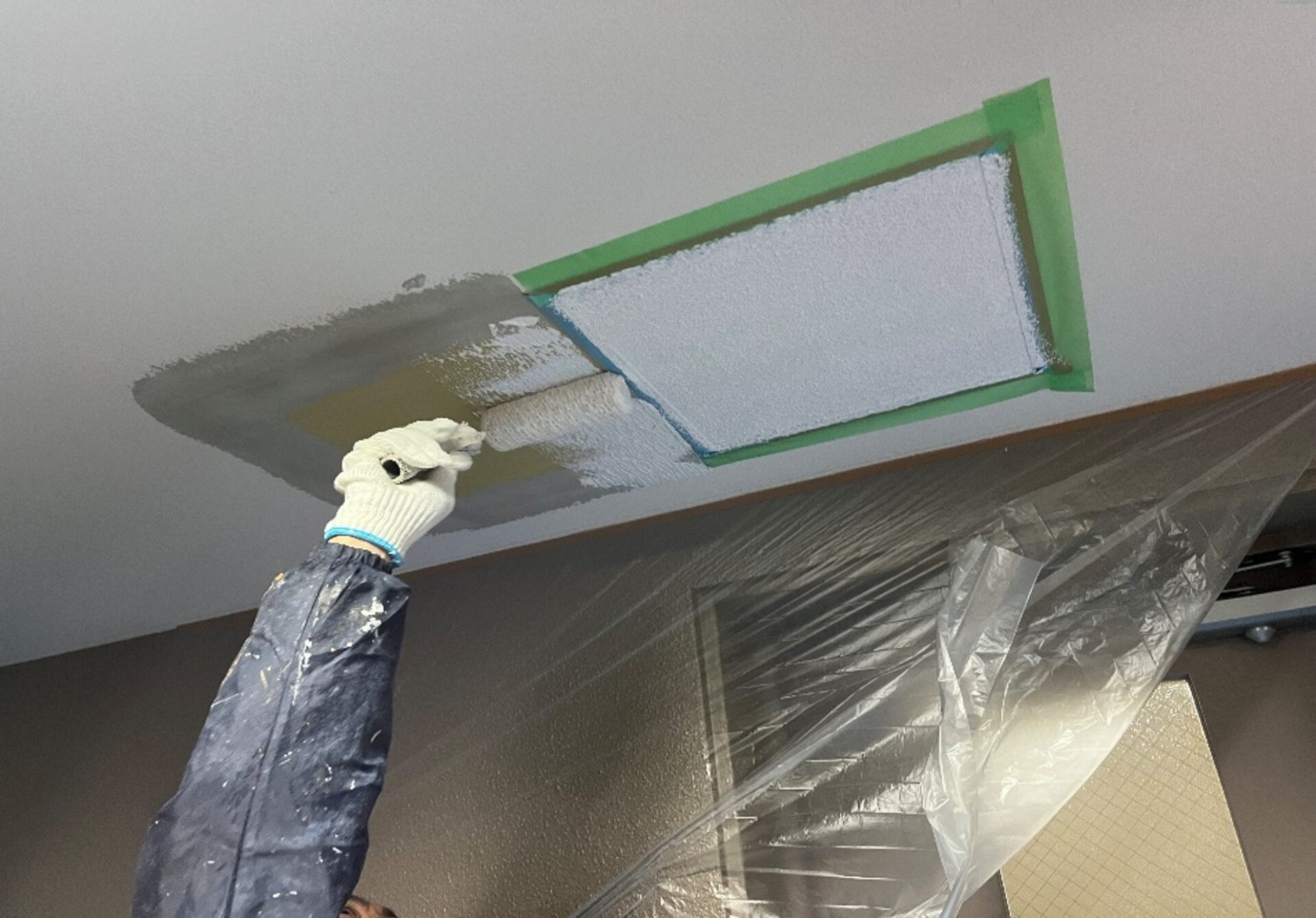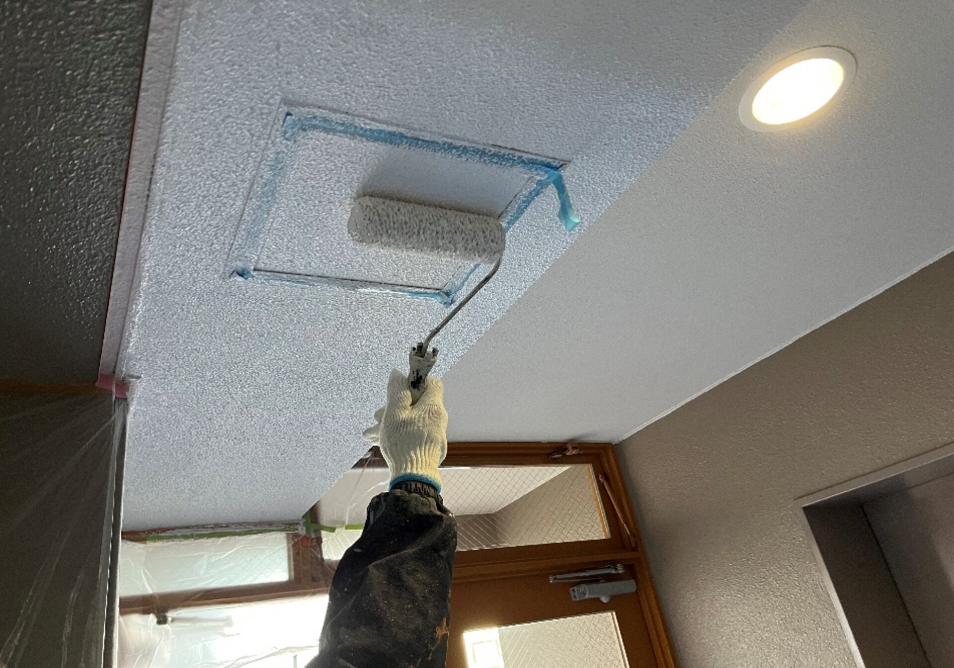 天井の補修を行い、新しい点検口を取り付けました。継ぎ目部分はパテで下地を整えた後、下塗り・上塗りと順に塗装し、仕上げていきます。