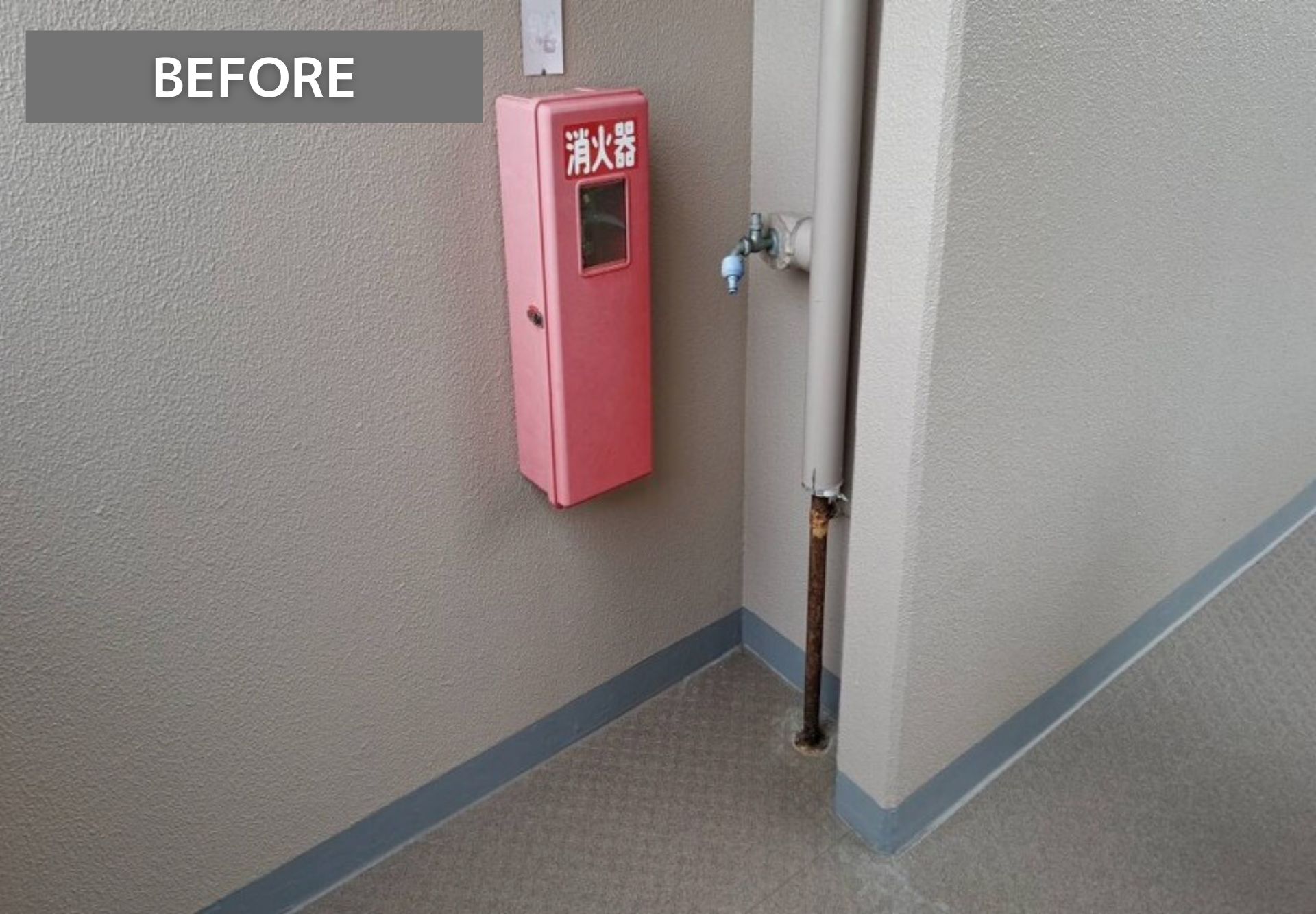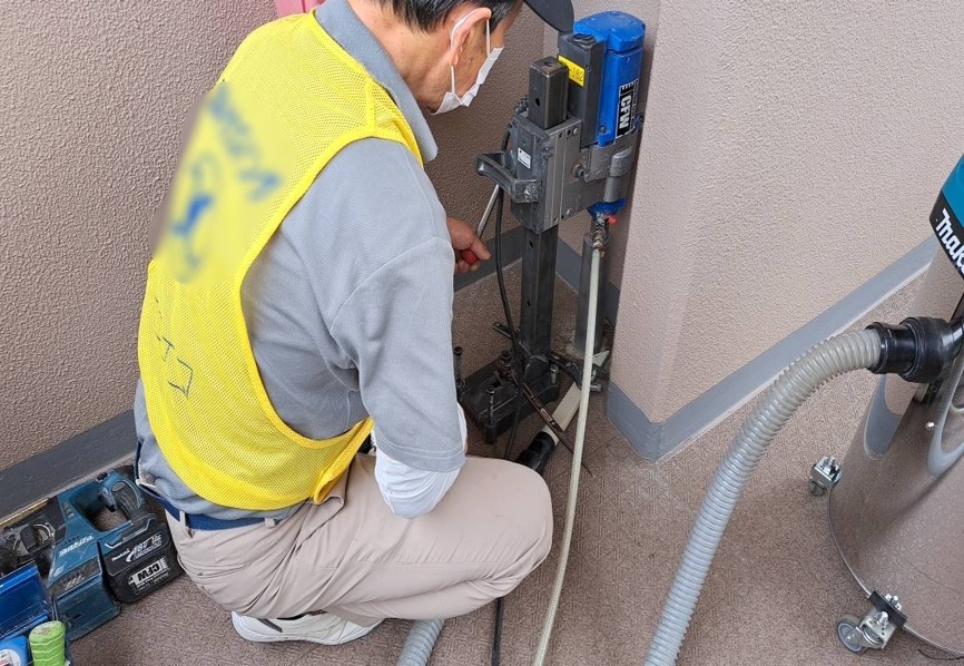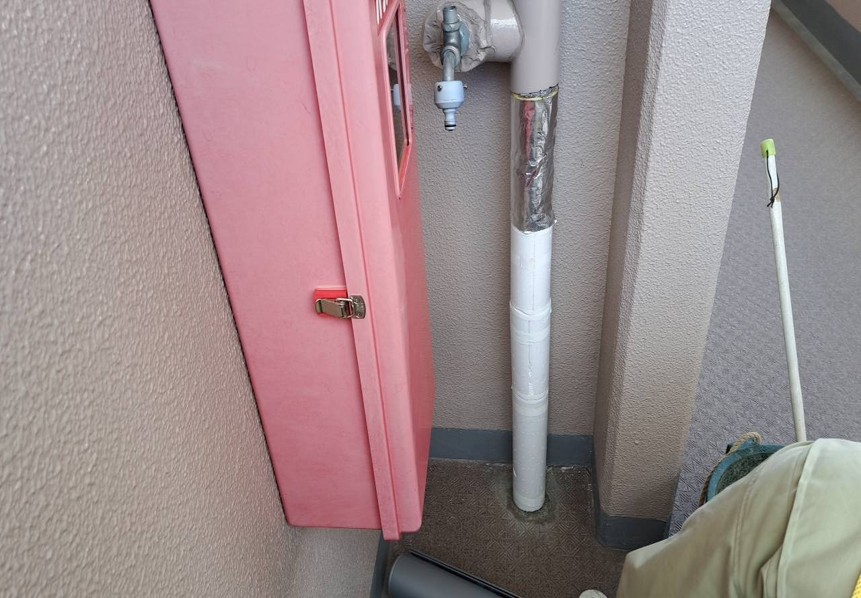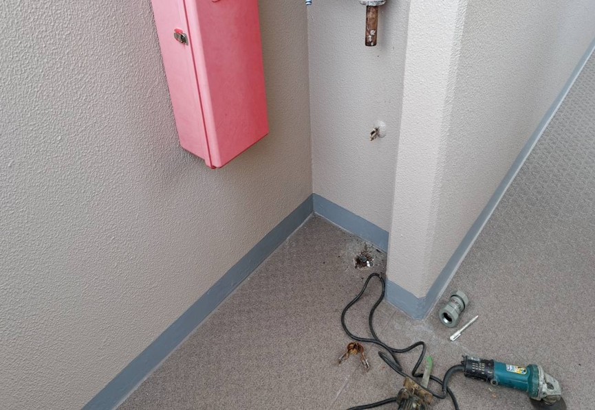 まずは給水配管を撤去し、新しい配管に交換します。次に、コンクリートの部分に新しく穴をあけ、配管を通します。配管まわりはモルタルで埋め戻します。結露や凍結防止の為、保温材をまきその上からカバーを取り付けていきます。最後に給水管を塗装し完成です!