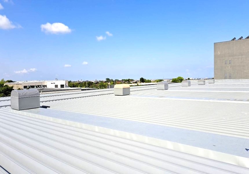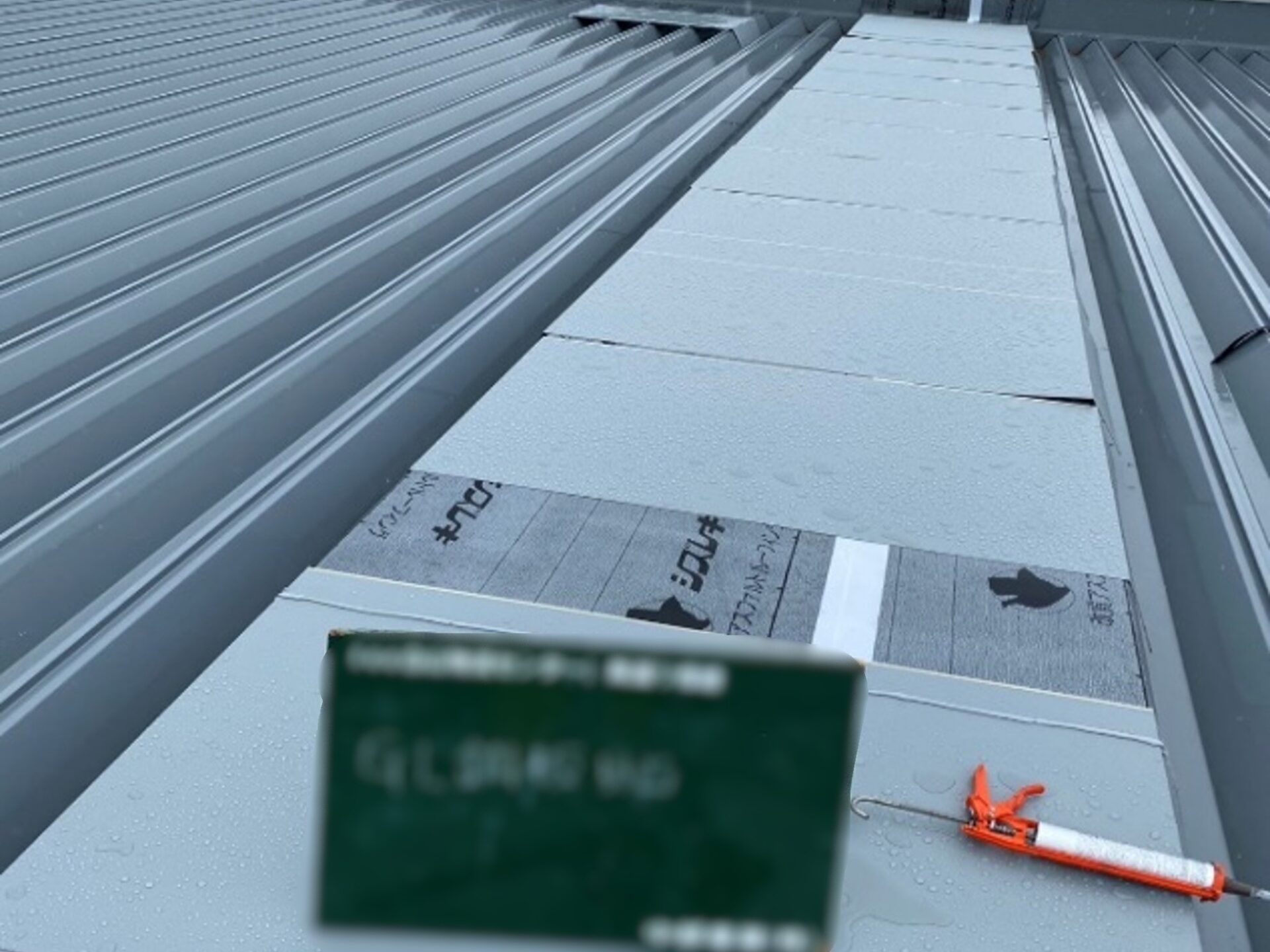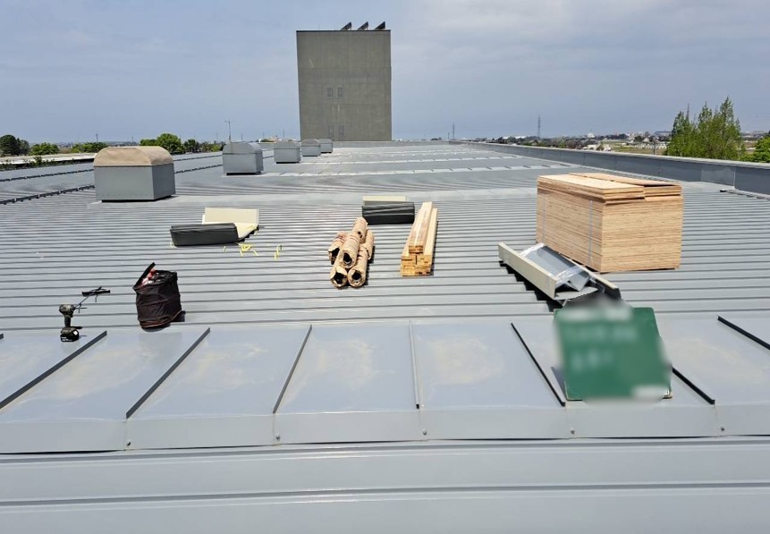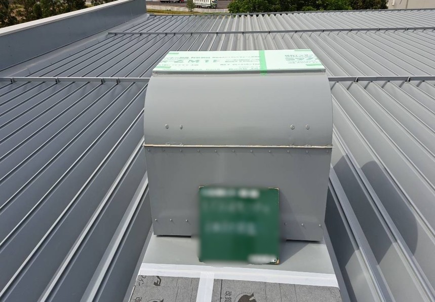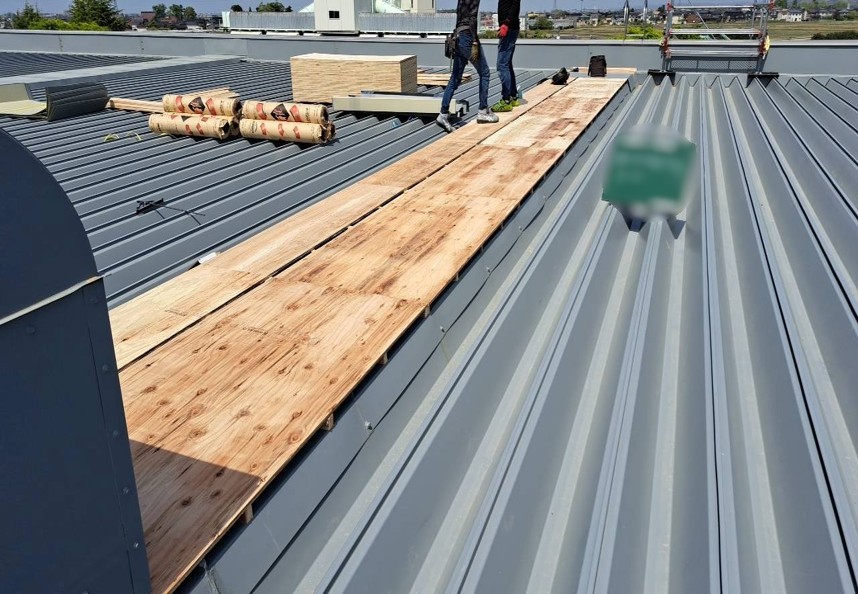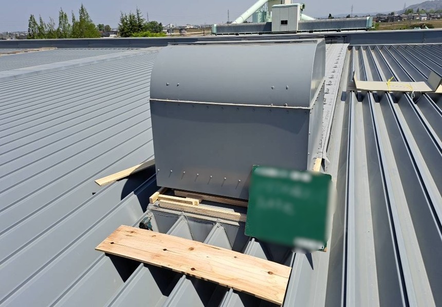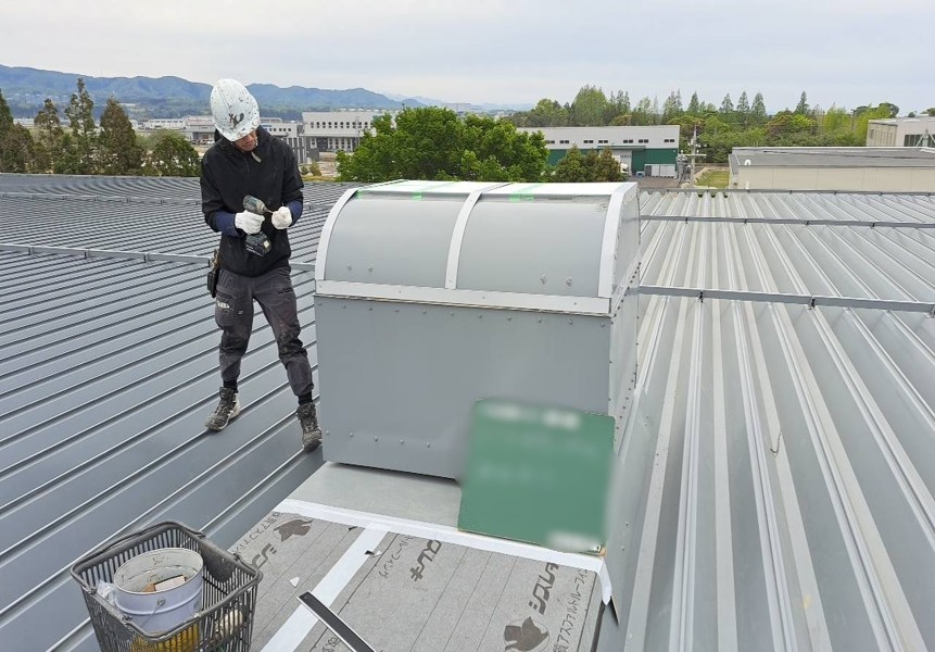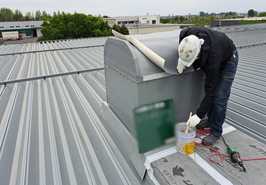 構造用合板の上に、アスファルトルーフィングを貼り、劣化していた部分を補強します。次に、ルーフファン天端の高さ調整をし、鋼板を取り付けていきます。