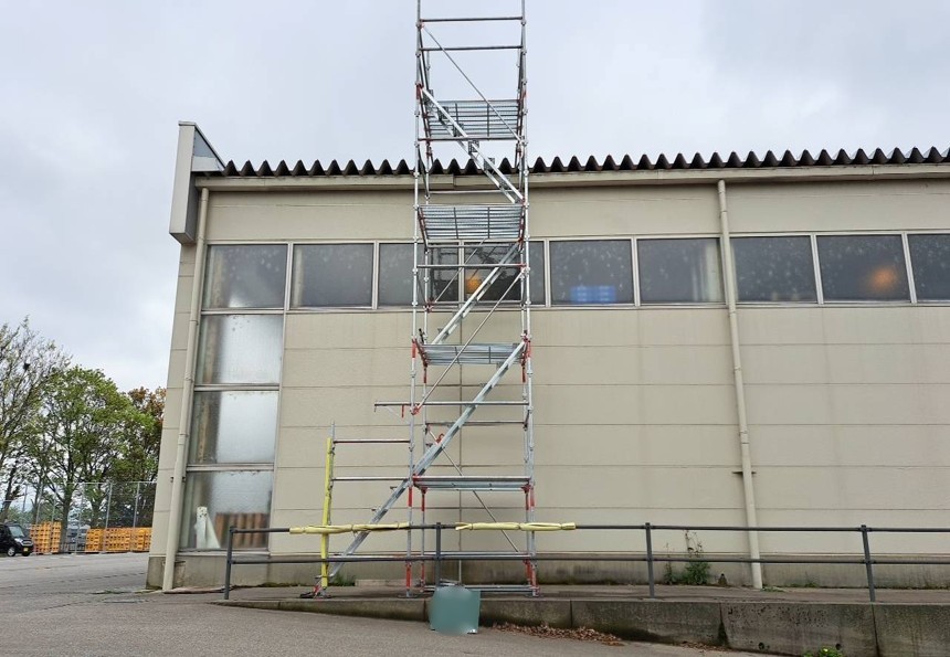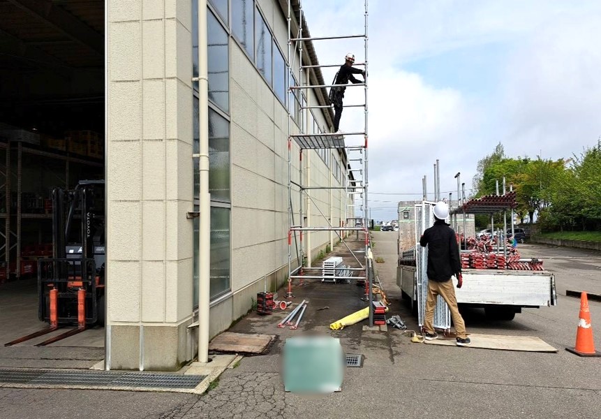 まずは昇降足場を組み立て必要な材料を屋上に置いていきます。仕上げとなる防水工事に向け、土台を組んでいき、垂木下地の上に構造用合板を貼ります。