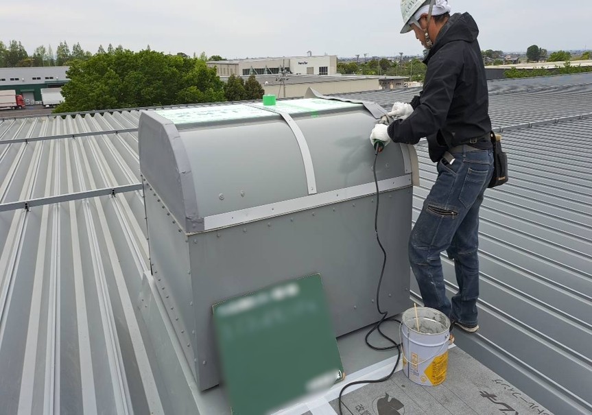 完了しました!屋上の換気扇(ルーフファン)まわりの防水処理を行い、雨水の侵入をしっかり防げる状態に改善しました。防水材を施工することで、漏水のリスクを軽減できます。事務所や店舗の雨漏り・漏水でお困りの方は、お気軽にご相談ください。