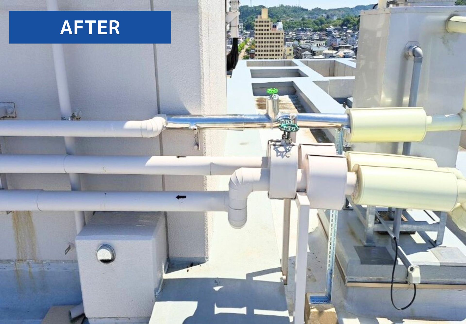 保温材(配管を覆っているカバー)を取り外して確認したところ、中の配管が錆びていて腐食し、穴が空いていました。まずは傷んでいる給水管を一部切断し、専用の継手(ハイパーソケット)を取り付け接続していきます。配管を安定させるため支持金物をつけ、保温材を施工します。最後に、ステンレスカバーを取り付け雨や衝撃から守れるよう仕上げて完成です!