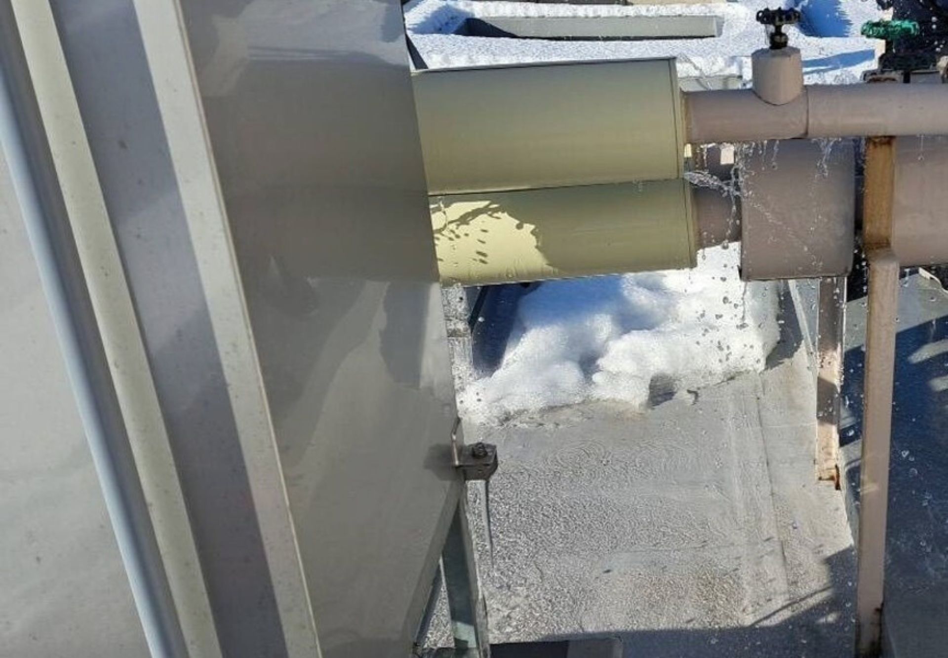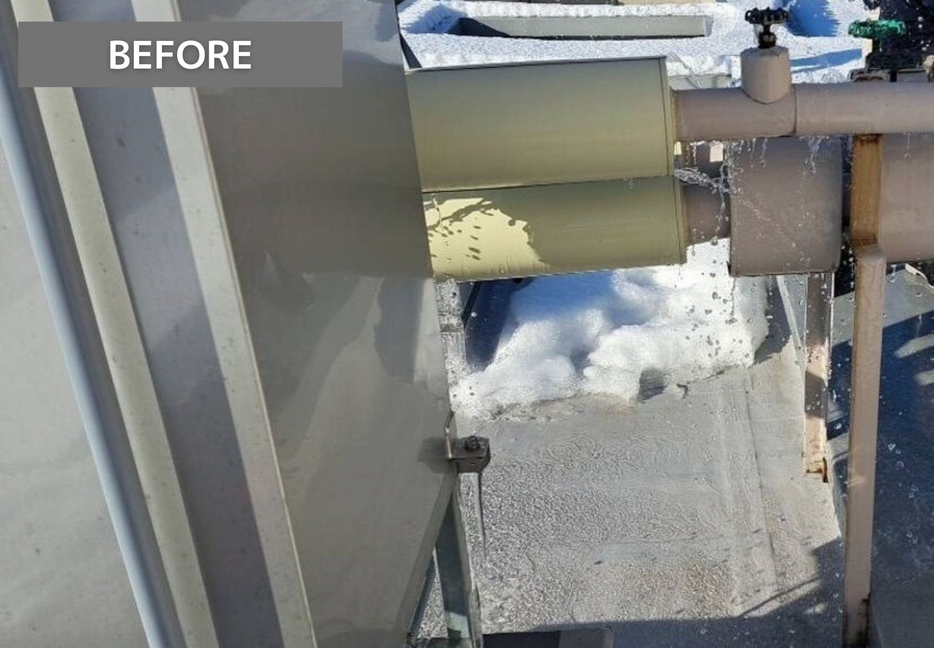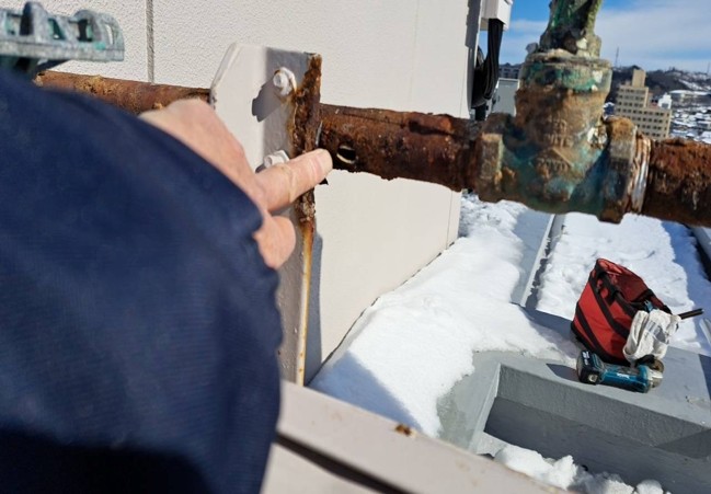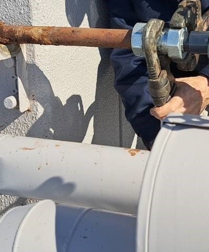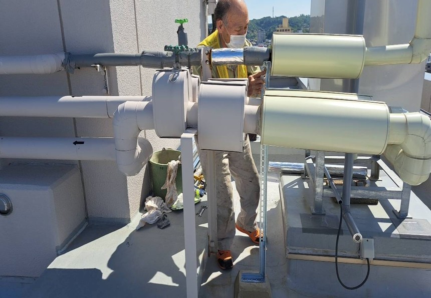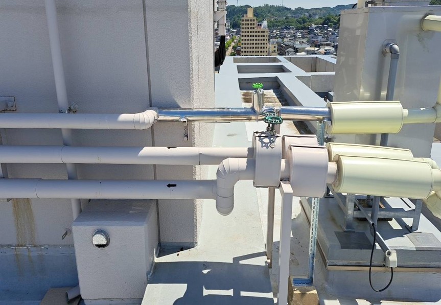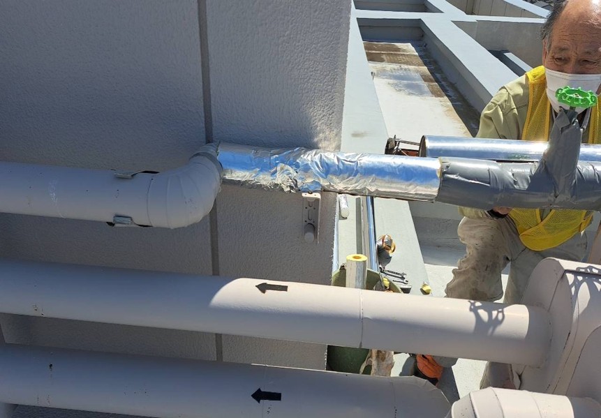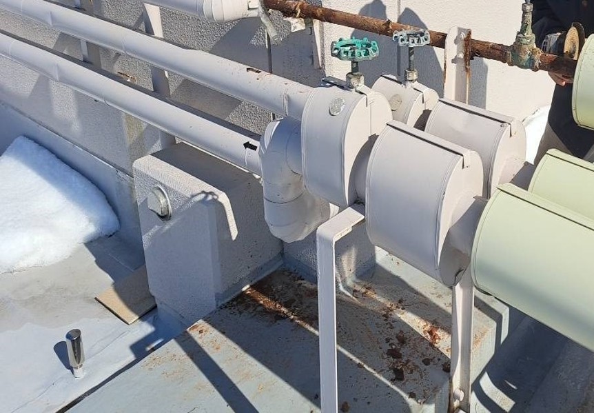 ひび割れが起き水が出ている状態でした。今回の工事では、損傷している部分の配管を切断、専用の継手で接続補修を行い、保温・固定金物まで整え、安全に使用できるように改善していきます。