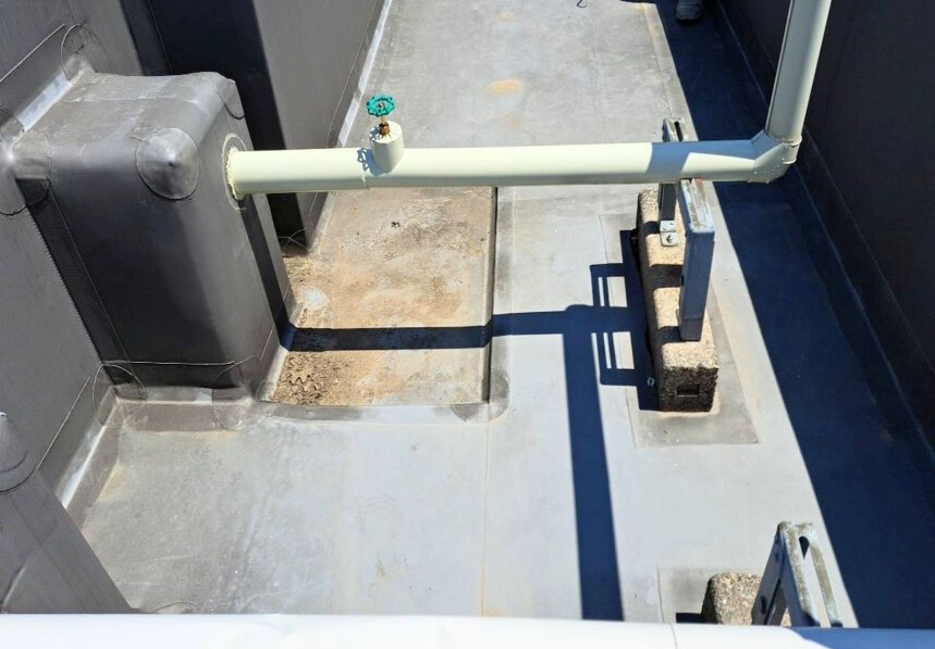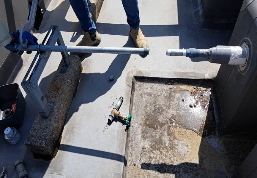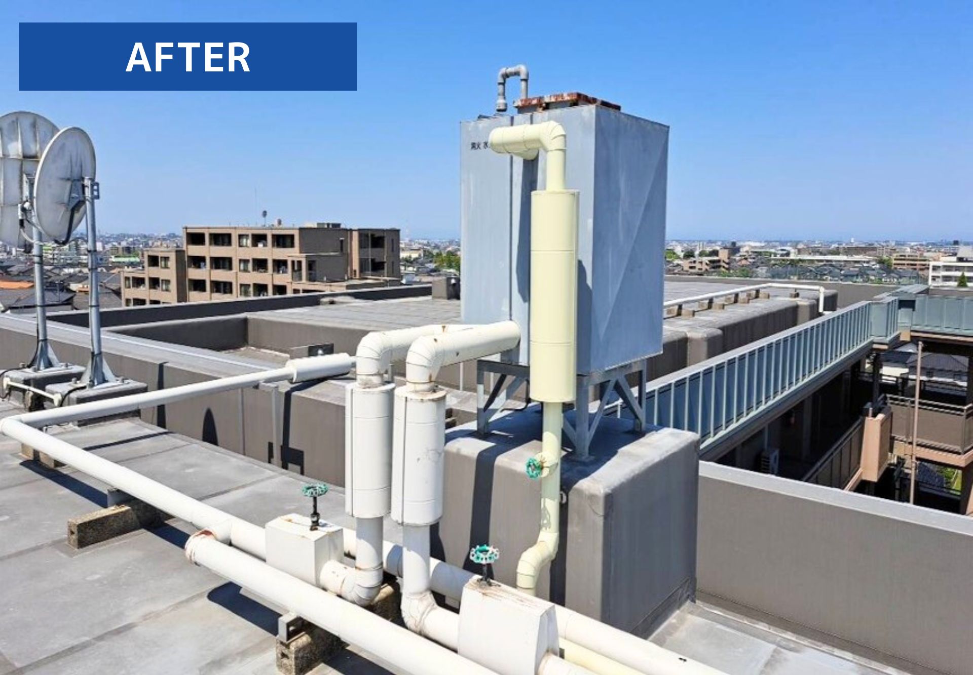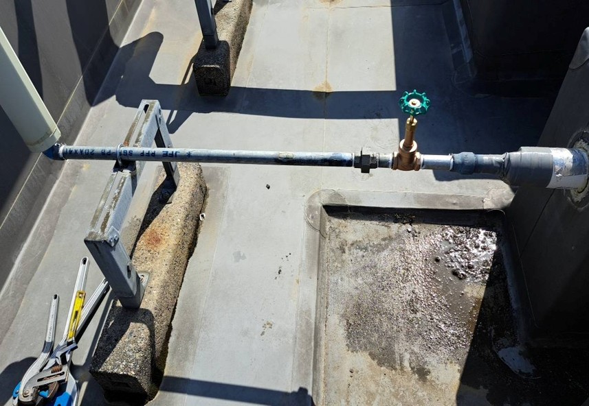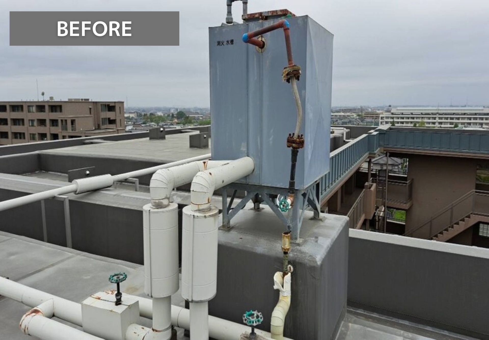 マンション屋上にある消火水槽の補助水槽につながる給水管が経年劣化により、給水管が曲がり錆びていました。給水管の起点にある既設バルブも古くなり、劣化が見られました。今回の工事では傷んだ給水管とバルブを交換し、安心して使用できる状態に改善していきます。