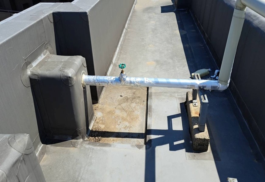劣化が見られた給水管を撤去し、新しい給水管へ取り替えています。次に配管が冷えたり結露したりしないよう保温材を巻き、外側に金属カバー(ラッキング)を巻き完成です!