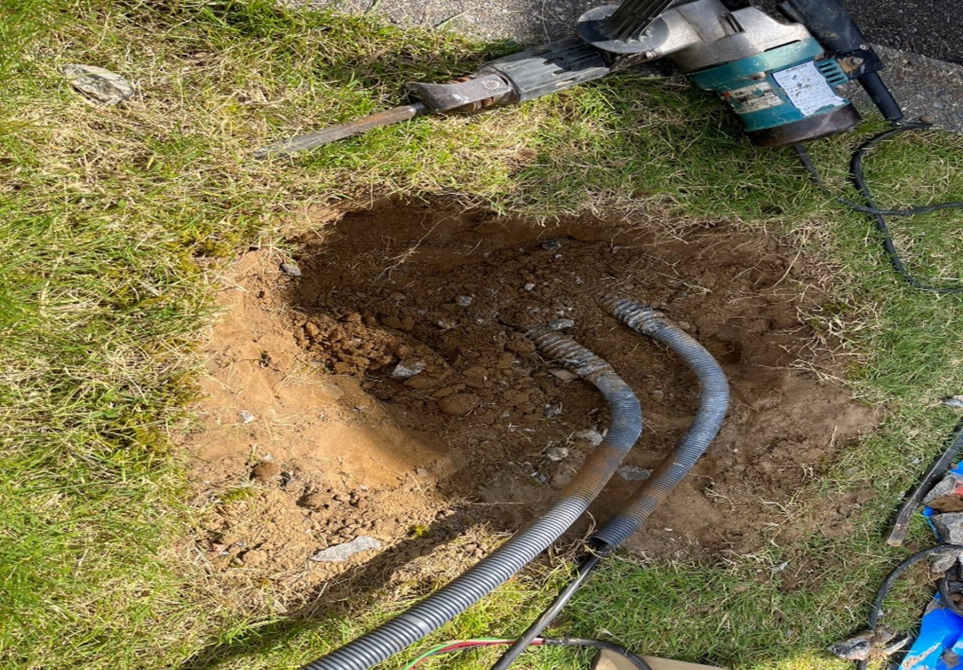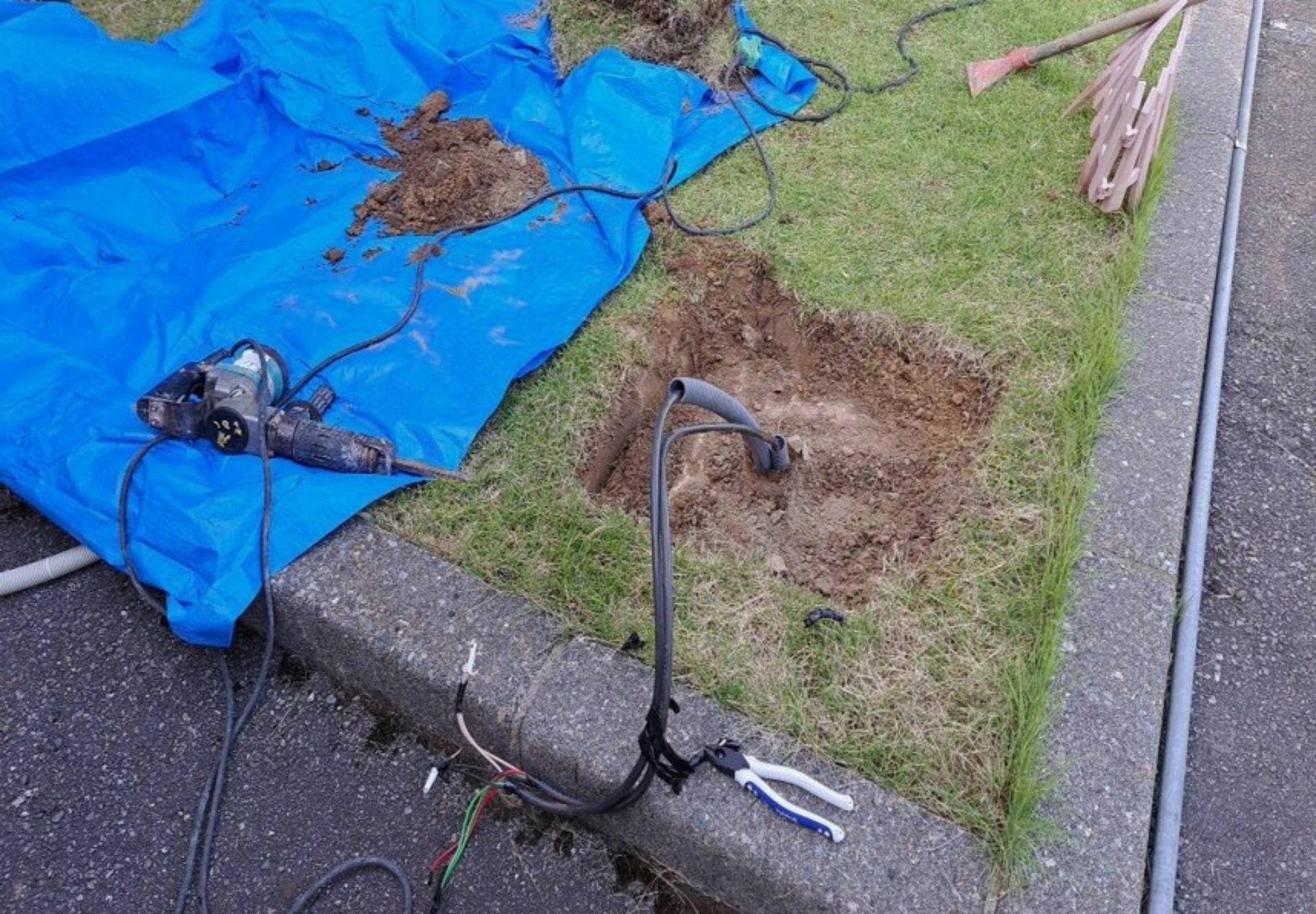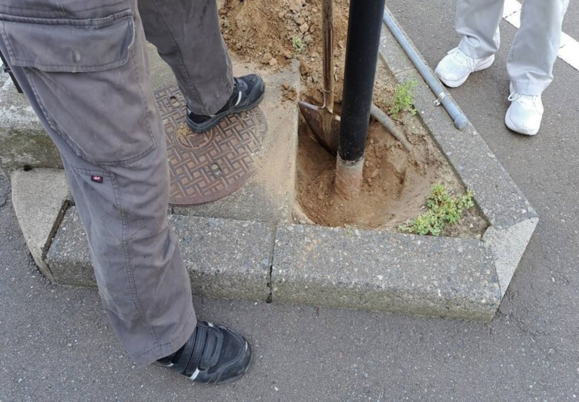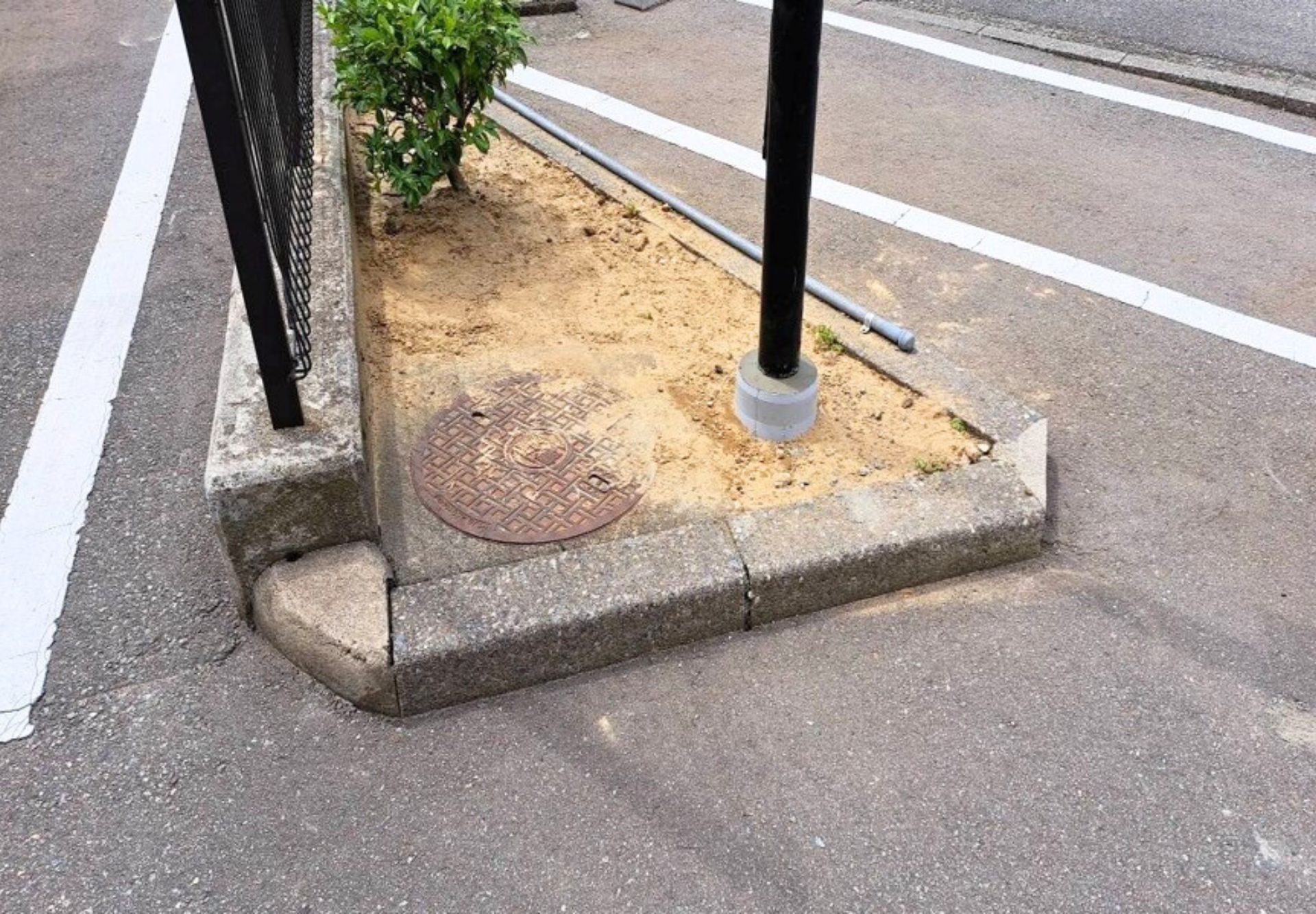 今回の工事では街灯ポールを新しく設置し、もう一つのポールの柱部分をモルタルで埋め戻す根巻き作業をし保護していきます。