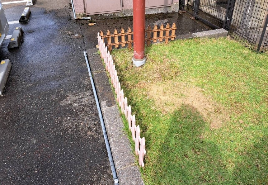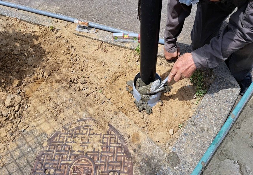 もうひとつのポールでは、柱の根元部分を保護するためモルタルで埋め戻し作業をしました。柱部分をしっかり保護することで、雨水による腐食を防ぐことができます。