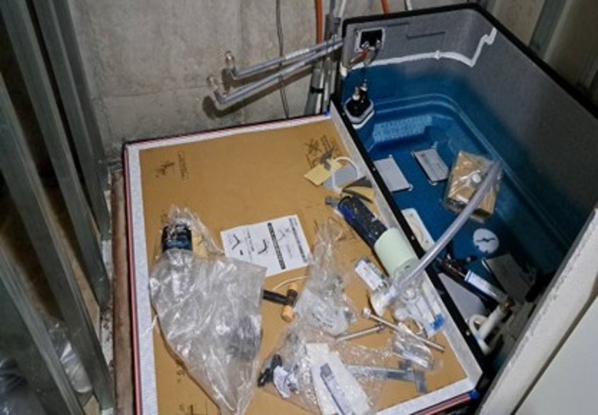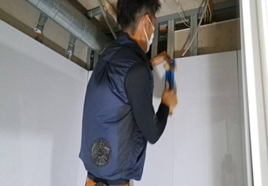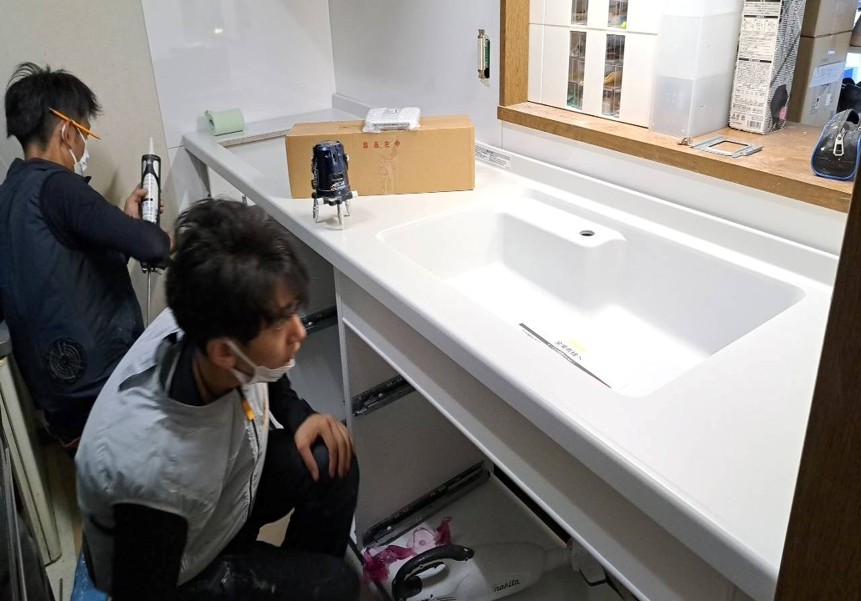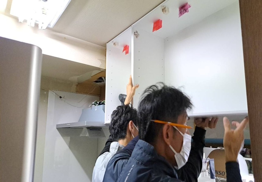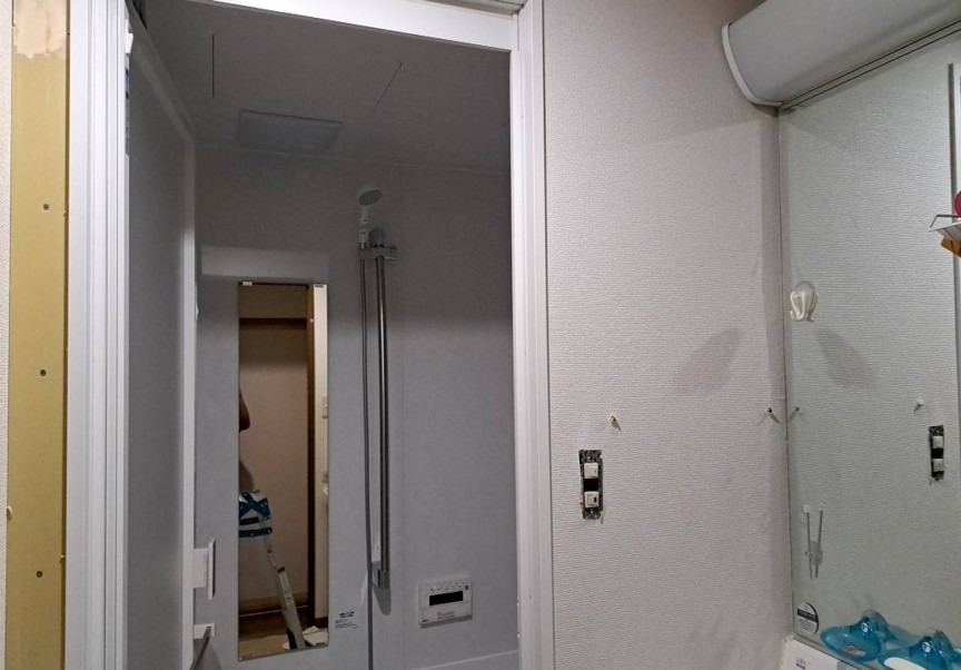 ユニットバスを組み立て、設置していきます。壁にキッチンパネルを貼り、吊り戸棚、キッチンの取り付けを進めていきます。少しずつ新しい設備が入り、浴室、キッチンの形が見えてきました!