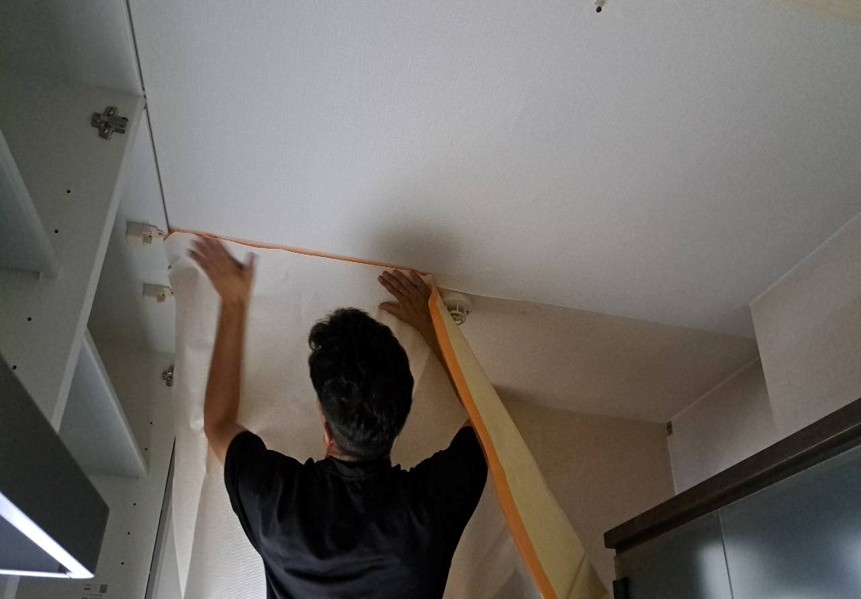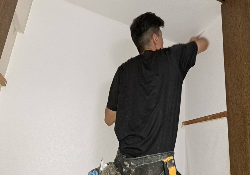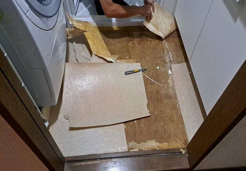 洗面やキッチン、クローゼットの内装工事を進めていきます。古くなったクロスや床のクッションフロアを捲り、新しく貼り替えていきます。壁紙が新しくなると一気に空間が変わります。完成まで後少しです!