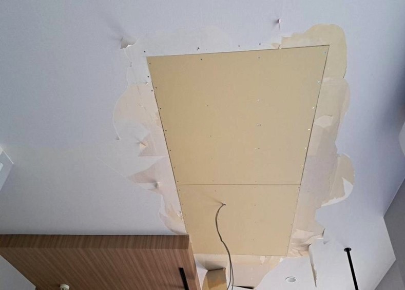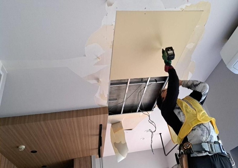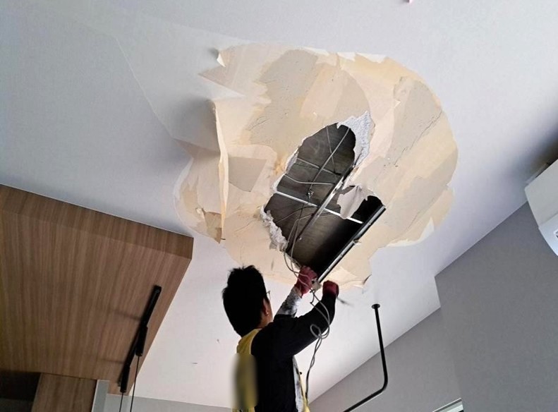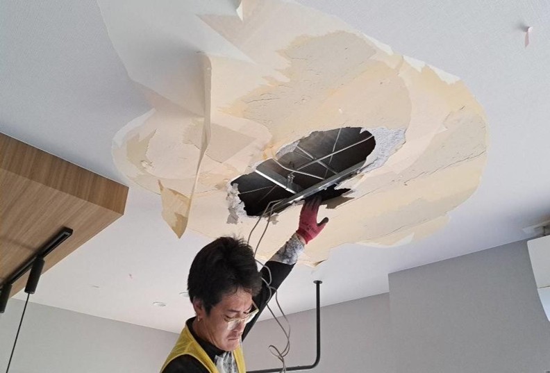 まずは居間の天井ボードを解体していきます。次に新しいボードを貼っていきます。