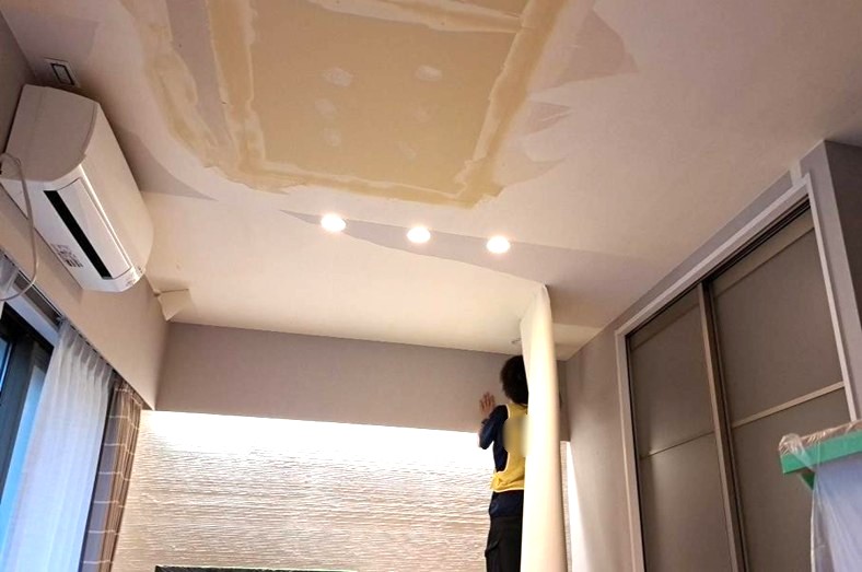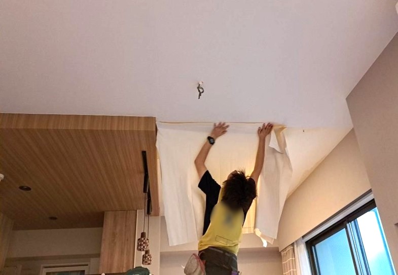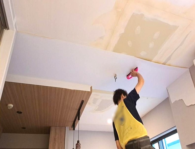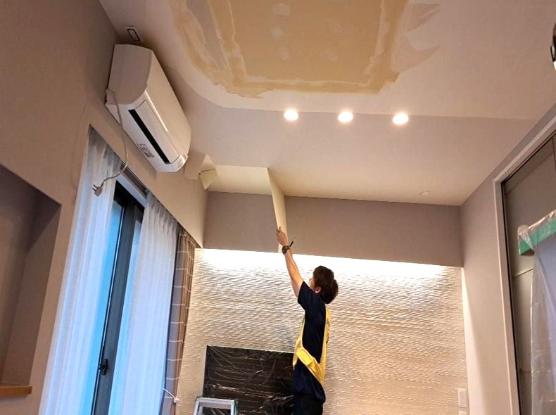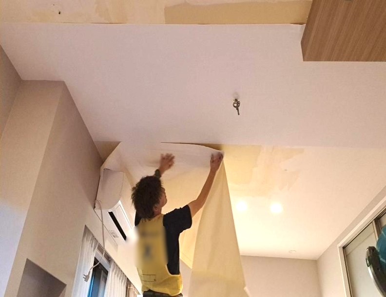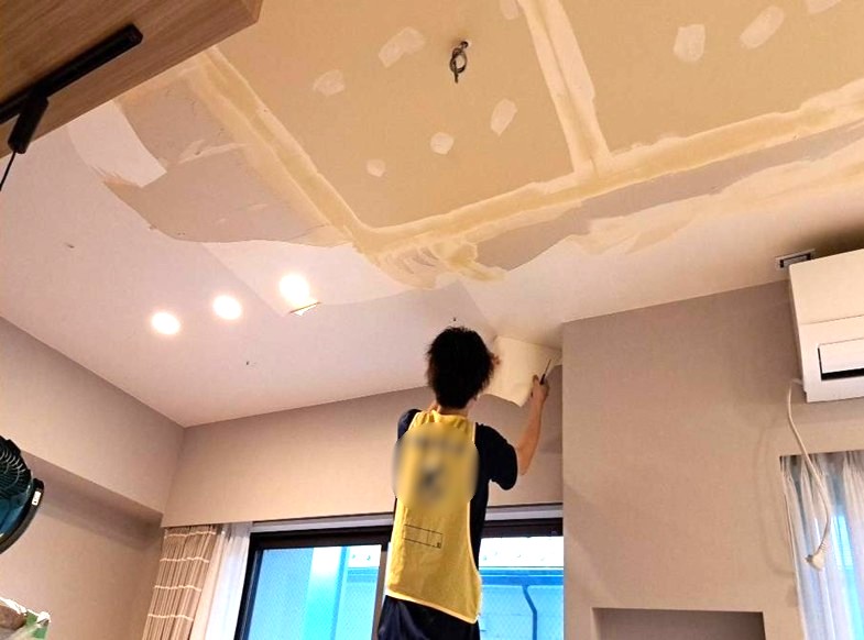 既存のクロスを捲り、下地を整えるパテ処理をします。次に新しいクロスを貼り、天井をきれいに仕上げていきます。