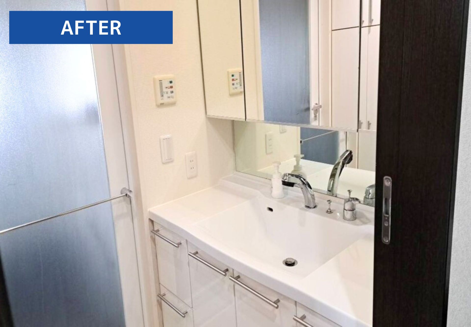 クロス貼り替えが完了しました!明るく清潔感たっぷりな洗面脱衣室に生まれ変わりました。お部屋の内装リフォーム、クロス貼り替えをお考えの方お気軽にご相談ください。