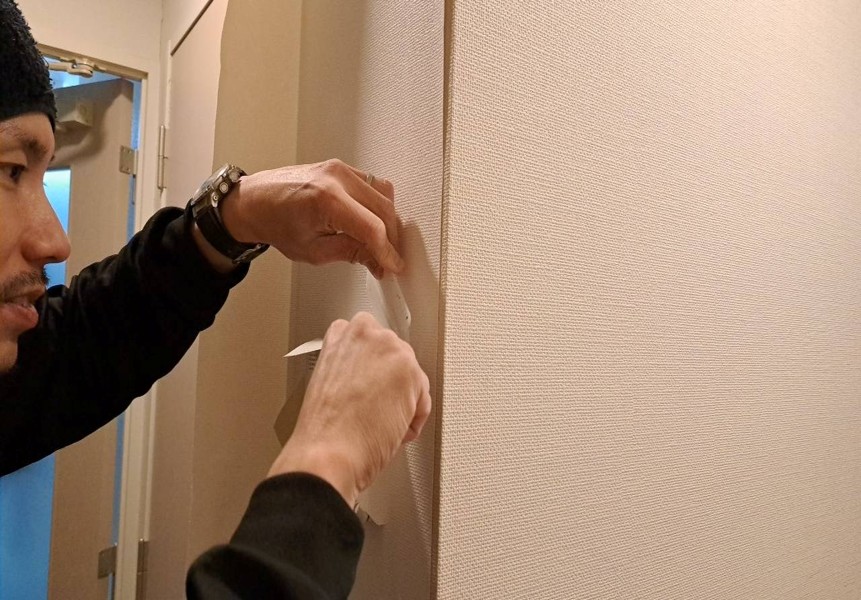 既存のクロスを捲り新しい壁紙にしていきます。