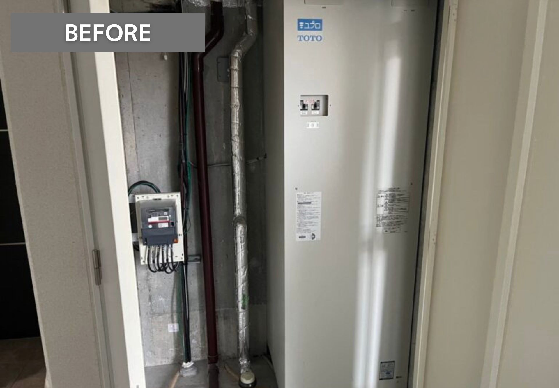 既存の温水器を撤去し、新しい電気温水器へ交換します。電気配線の工事をし、交換完了です。