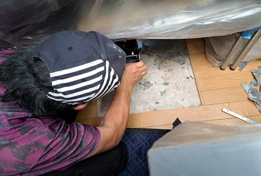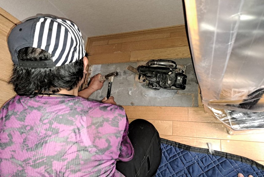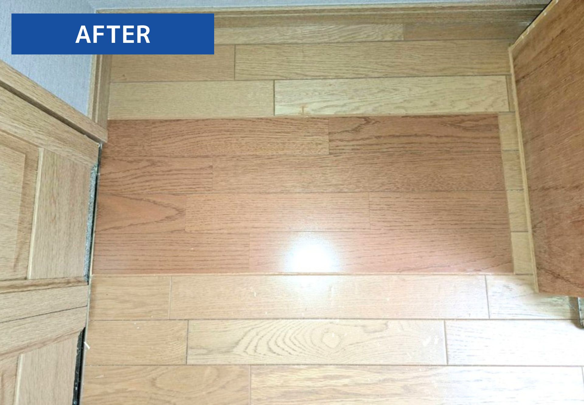 まずは床材を捲り、下地を整えるため古い部分を削り新しい床材に貼り替え完成です!