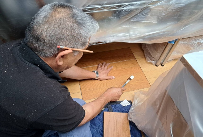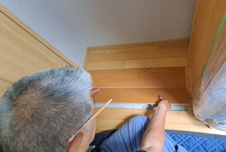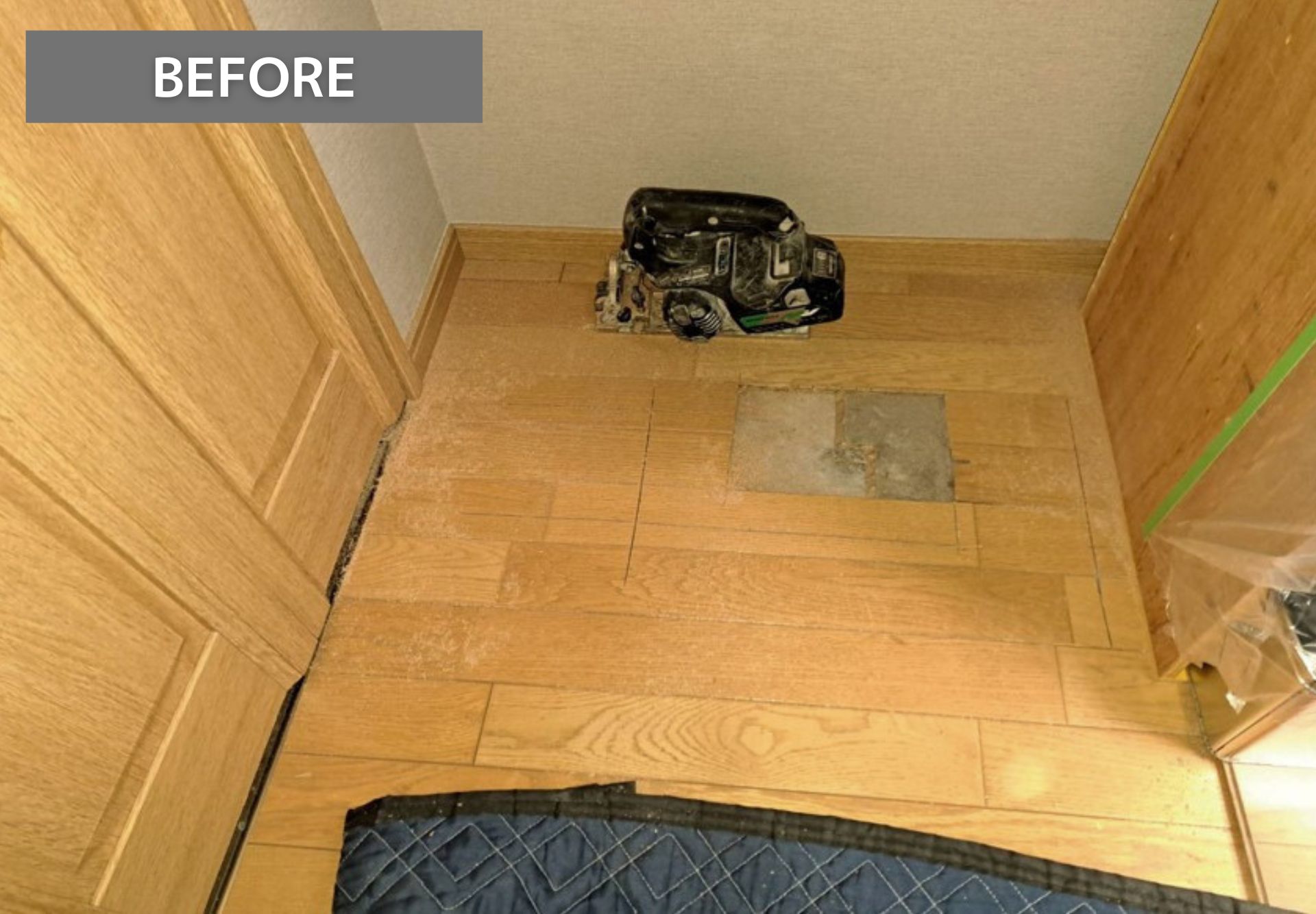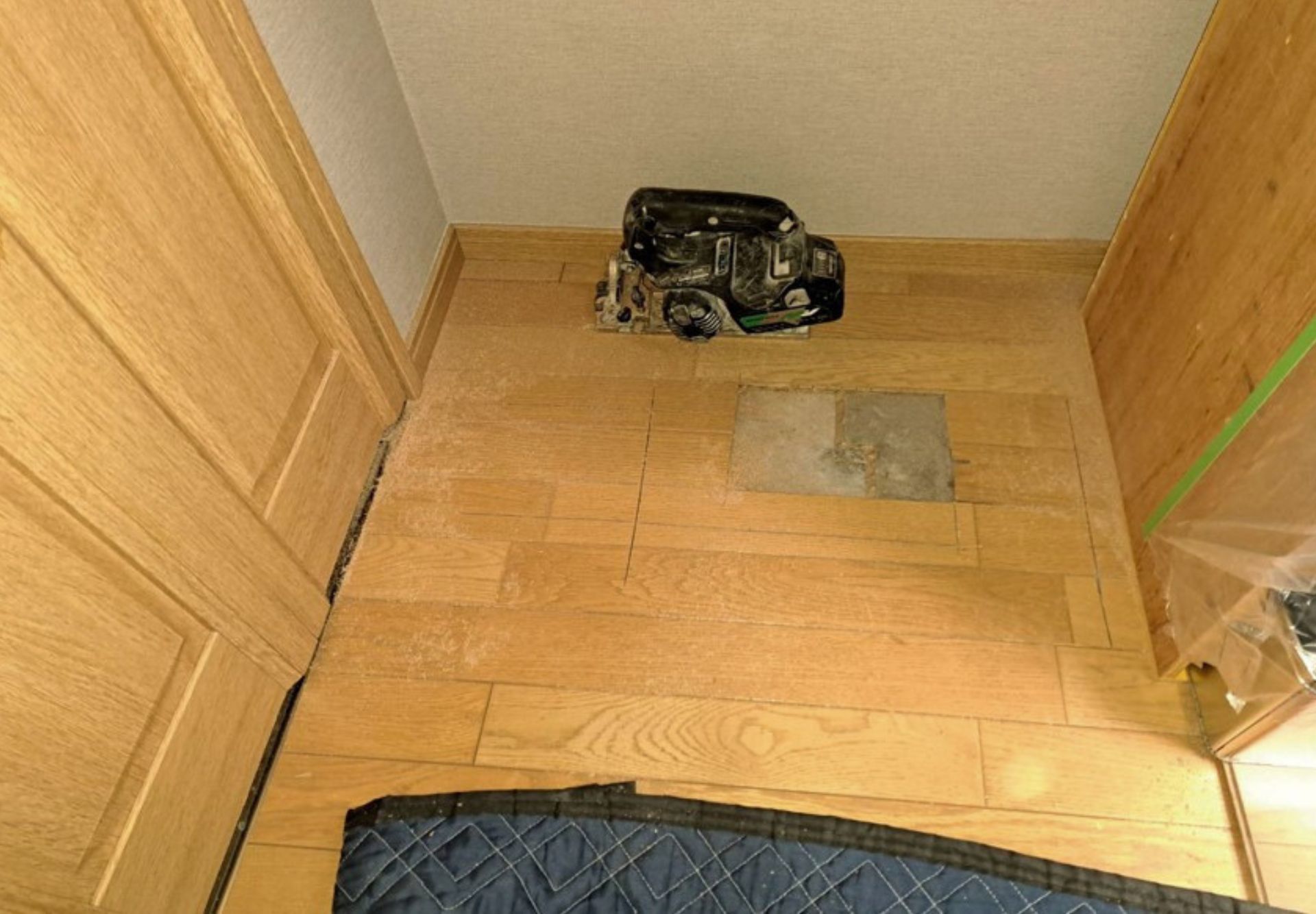 床の一部にめくれや傷みが見られる状態でした。今回は部分的に床の貼り替えを行っていきます。