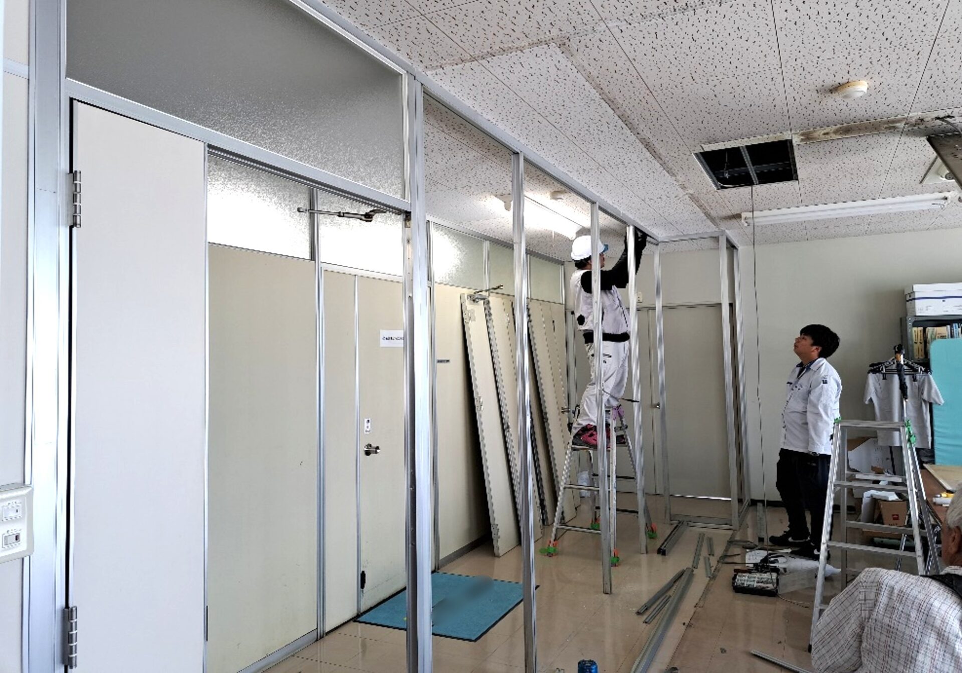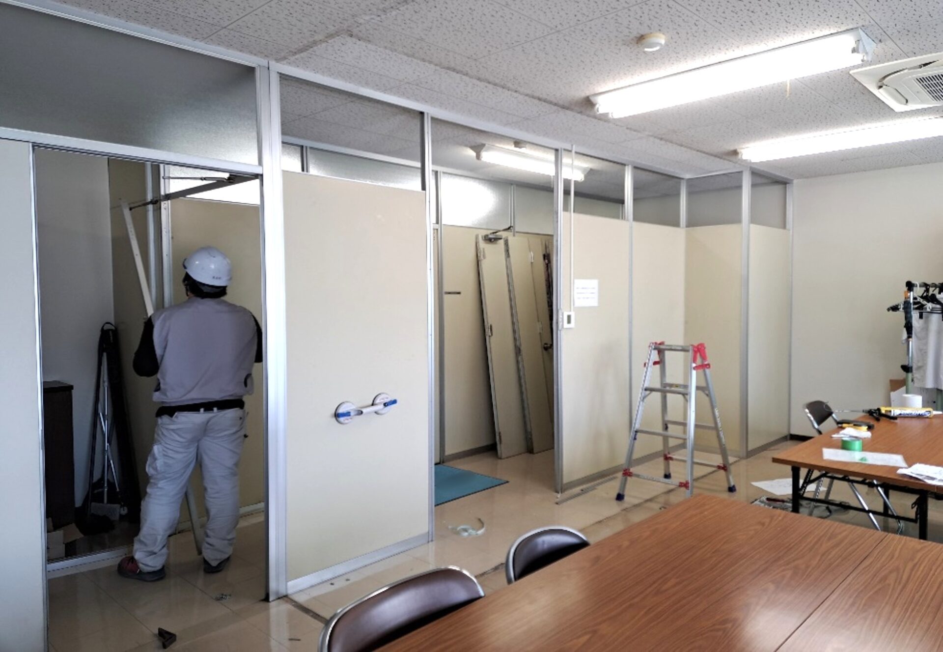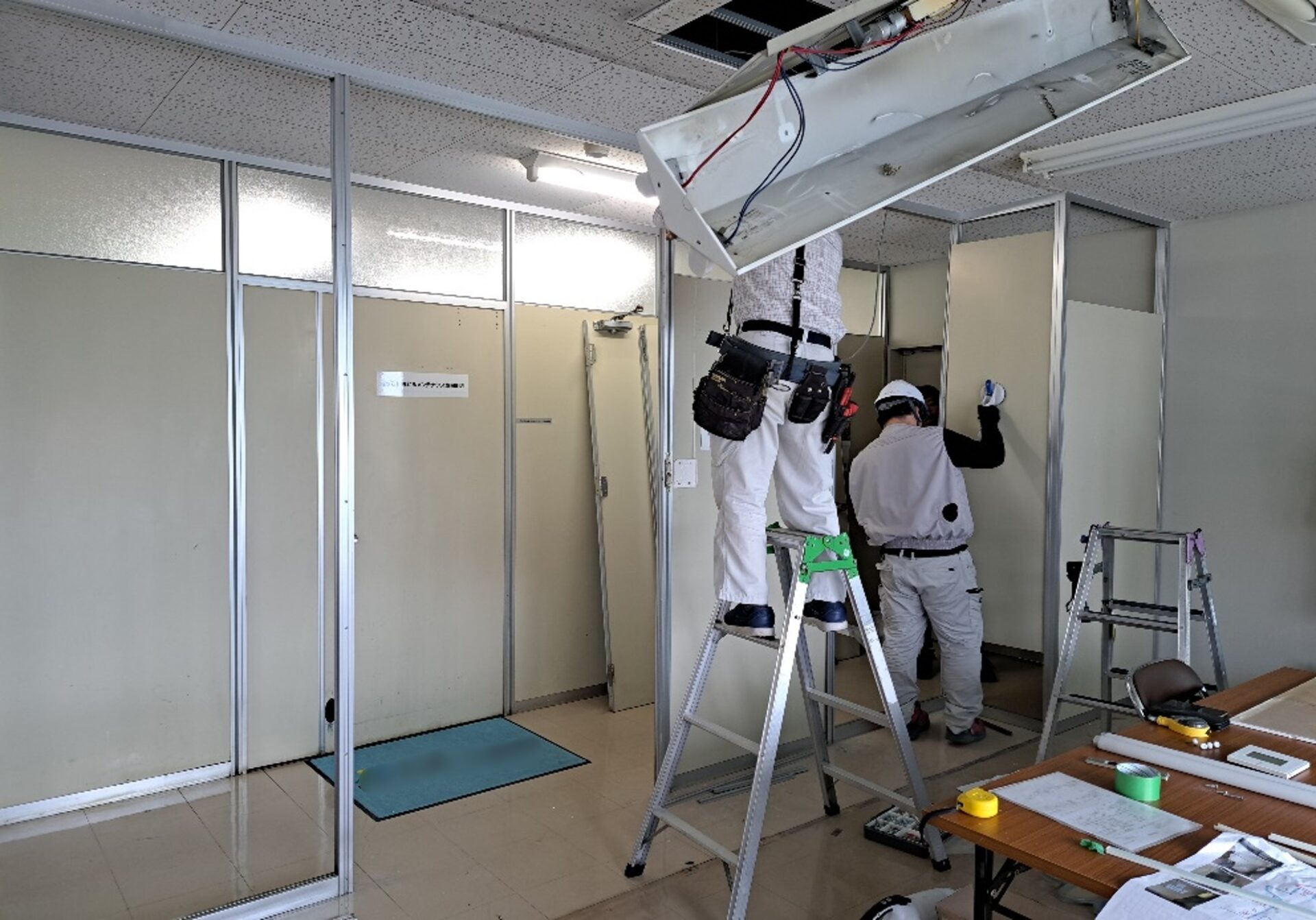まずは既存のパーテーションを解体し新しく移設し組み立てていきます。次に配線工事も行い、完成です!